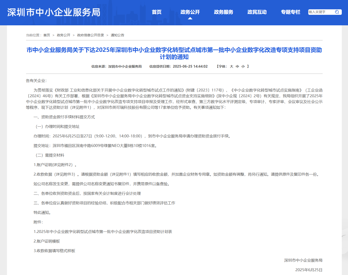 为贯彻落实《财政部 工业和信息化部关于开展中小企业数字化转型城市试点工作的通知》(财建〔2023〕117号)、《中小企业数字化转型城市试点实施指南》(工企业函〔2024〕46号)有关工作部署,根据《深圳市中小企业服务局中小企业数字化转型城市试点资金支持实施细则》(深中小企规〔2024〕2号)有关规定,深圳市中小企业服务局组织开展了2025年中小企业数字化转型试点城市第一批中小企业数字化改造专项支持项目申报及受理工作,经形式审查、第三方数字化水平评测定级、专项审计、专家评审、会议审议及社会公示等程序,现下达资助计划,对深圳市英可瑞科技股份有限公司等17家单位给予资助。有关事项通知如下: