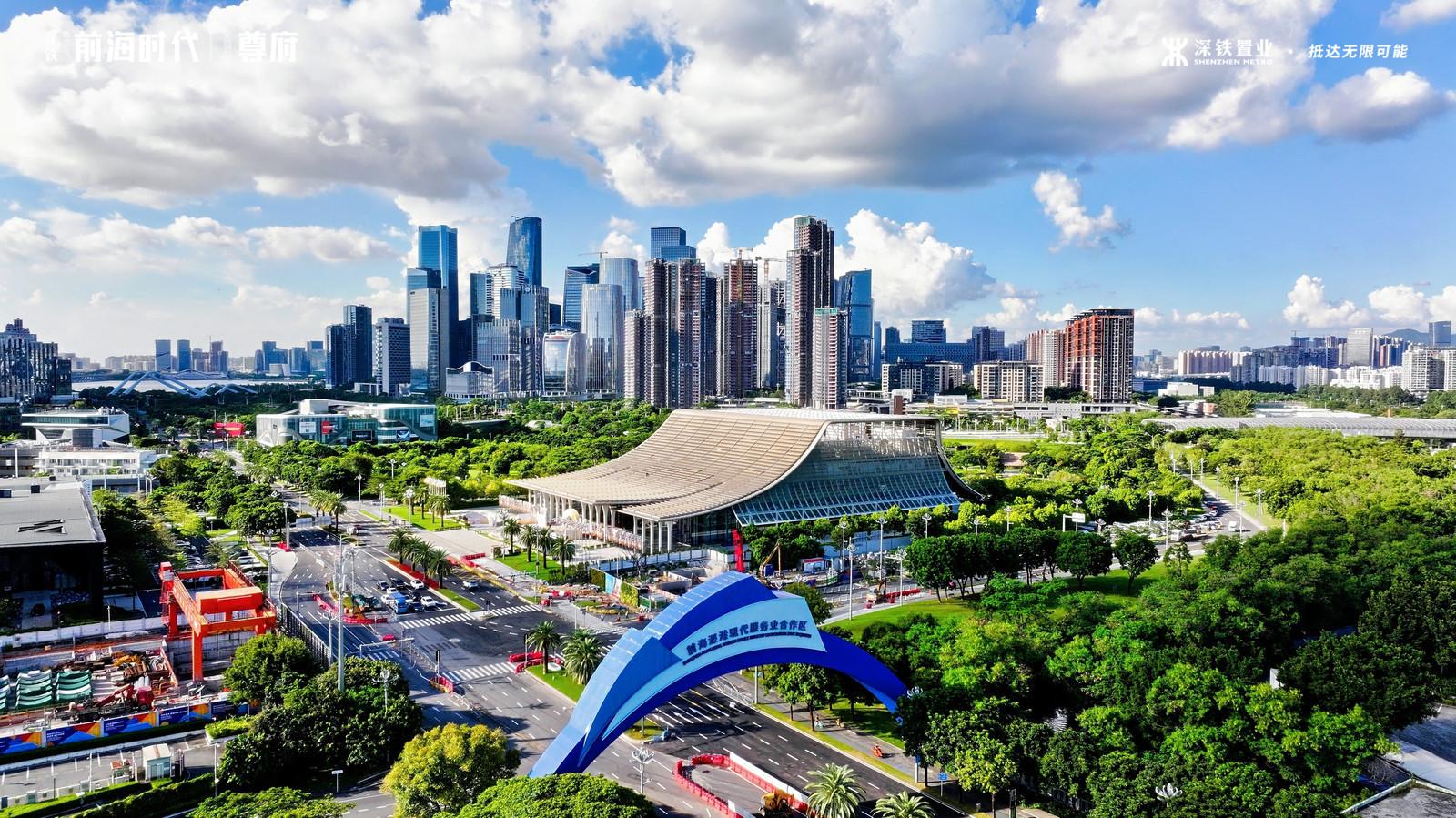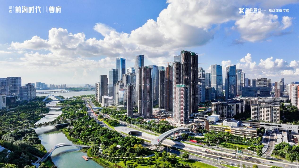 由深铁置业打造的前海时代尊府项目位于前海桂湾核心区,毗邻滨海大道与桂湾河,南望桂湾公园、远眺山海,是深铁置业践行“轨道+物业”TOD模式的示范项目。