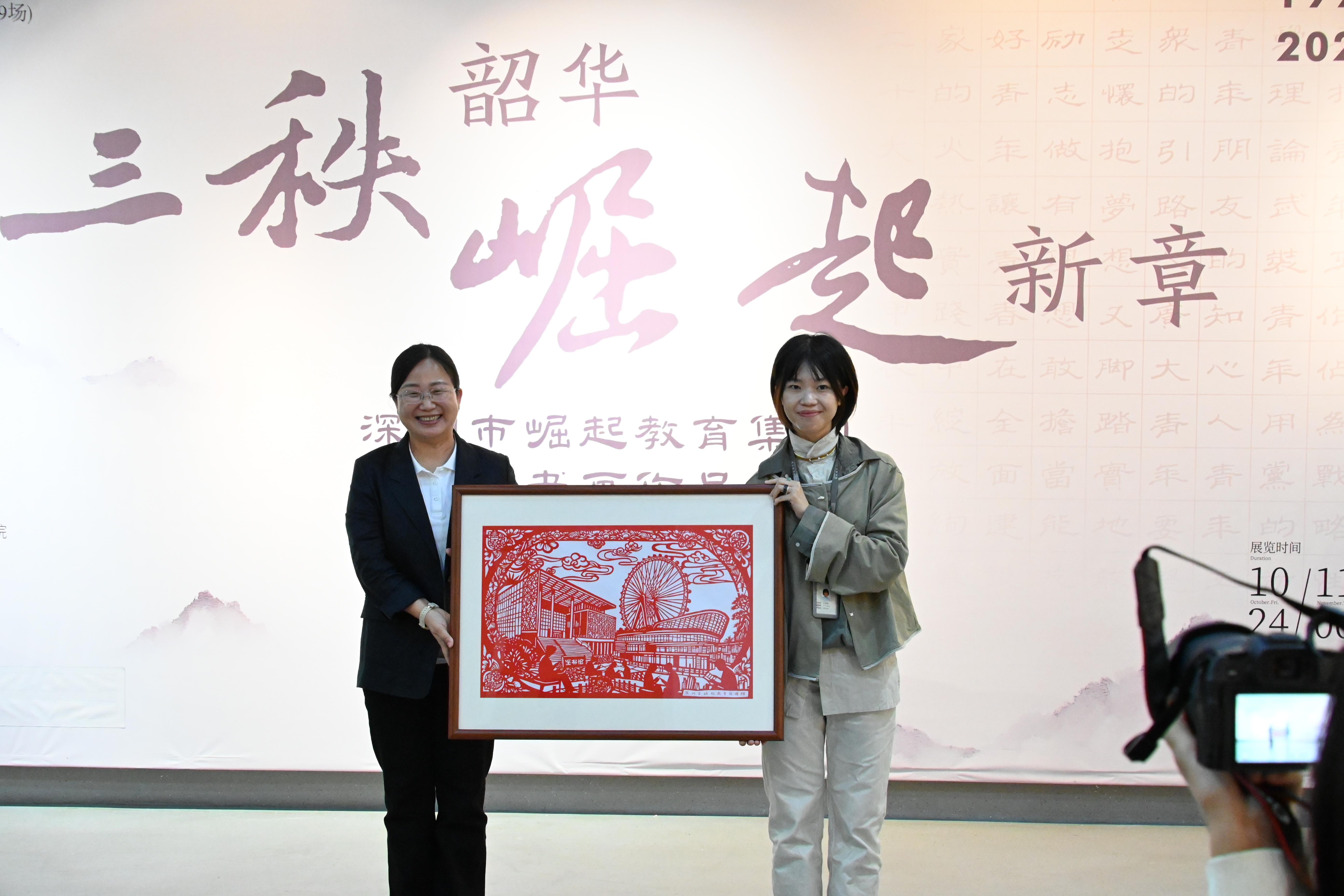 仪式现场,李晶代表崛起教育集团向宝安图书馆赠送了由崛起师生精心创作的剪纸艺术作品,宝安图书馆副馆长叶雨萌代表接收。