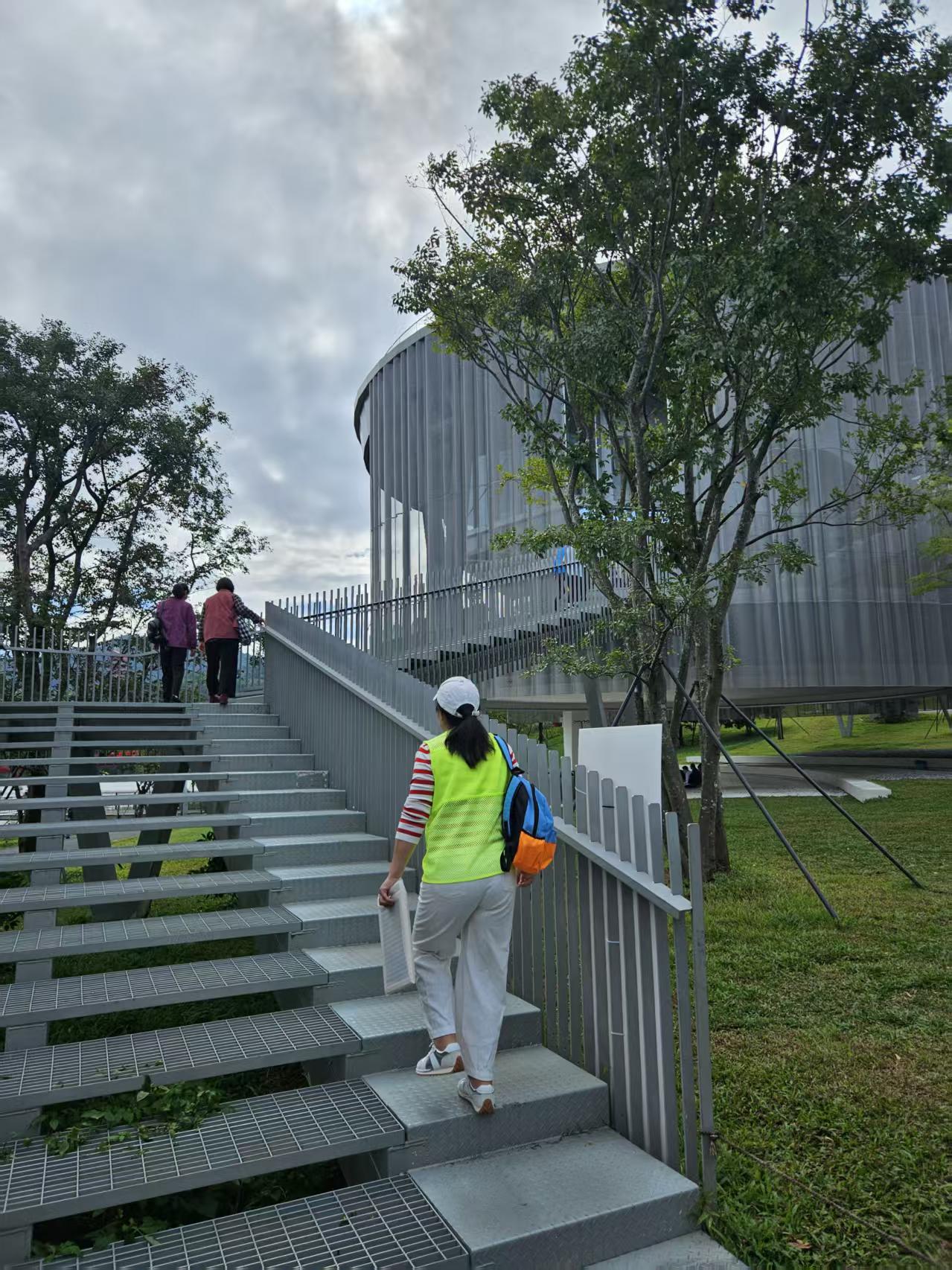 开门即红的虹桥公园,也在不断迭代升级。2023年,光明区开始实施碧眼水库水环境综合提升工程,对大坝进行美化、对周边湿地提升改造。我们右前方不远处,就是2024年10月开放的“日熹阁”。这座以简洁圆柱形呈现的建筑,负一层是一个小剧场,一层是开放式书吧及咖啡吧,二层为可容纳100人的多功能会议厅,巧妙地将公园路径与建筑流线结合在一起。
