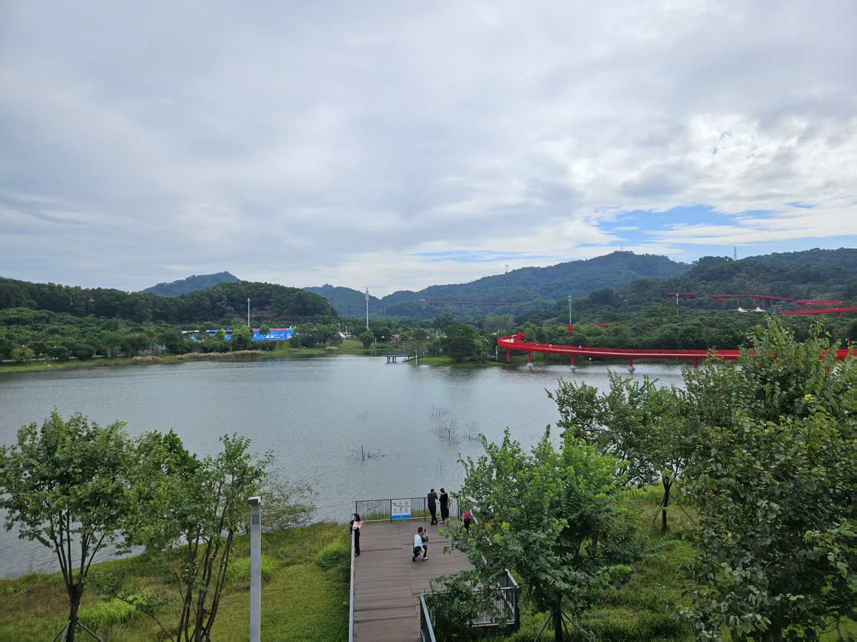 穿过广深港和赣深高铁桥,眼前豁然开朗——碧眼水库宛若碧玉镶嵌在群山间,远处青山间虹桥跌宕,红色空中廊道如丝带般蜿蜒于连绵的绿意之上,与周围的自然景观相得益彰。
