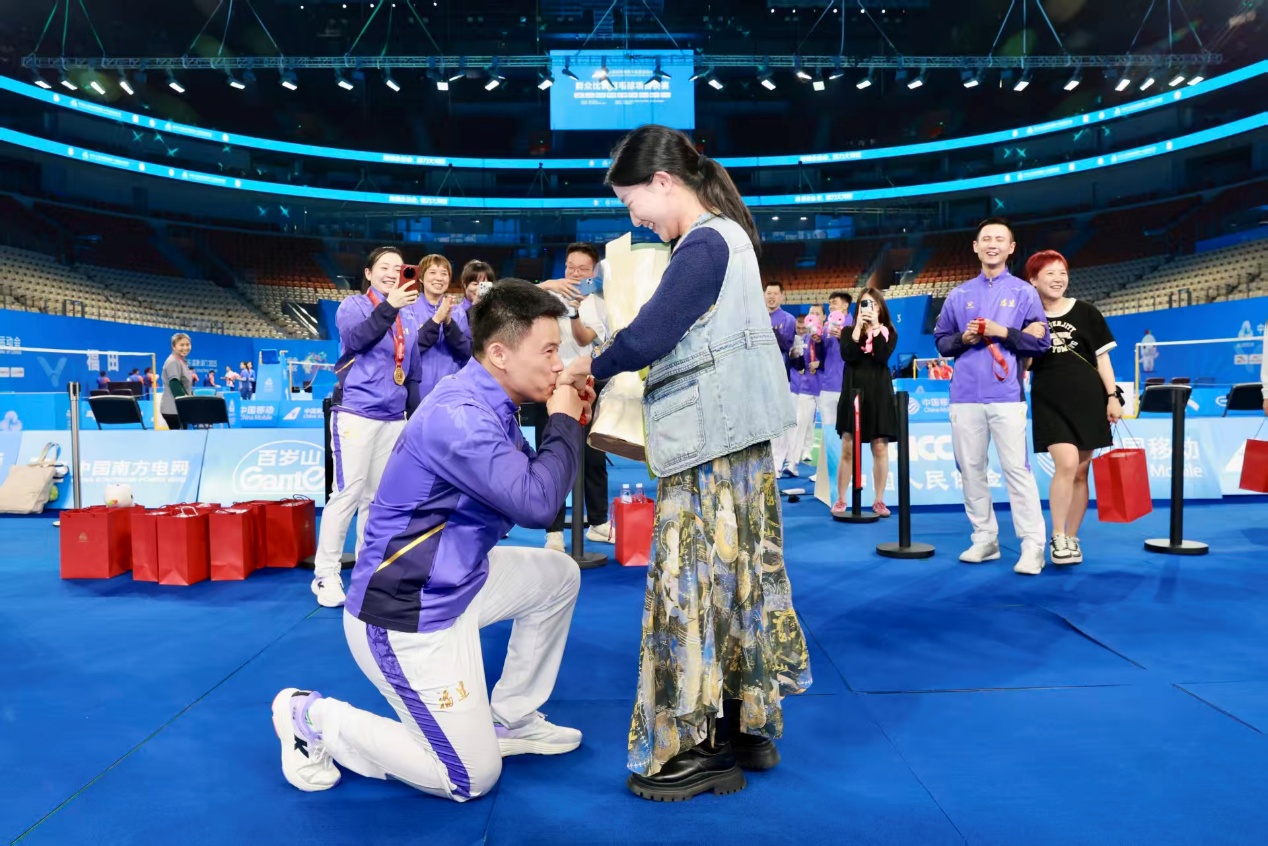 福建队夺得混合团体B组金牌,除了沉浸在夺金的喜悦,还上演了全运会赛场求婚的甜蜜时刻。在颁奖仪式结束后,福建队B组男双主力陈扬现场单腿跪地,拿着一束鲜花向自己的女朋友曾女士求婚。两人也是因为平时打羽毛球而认识,这次曾女士到深圳一直陪伴陈扬全程比赛。当陈扬求婚一刻,曾女士表示自己非常激动,因为自己事前并没有想到。