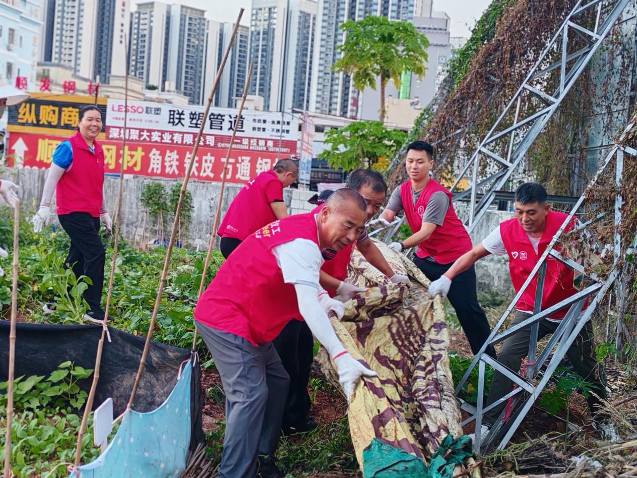 此动打破单一参与模式,由社区党群服务中心、新时代文明实践站牵头,联合巴士集团布吉党支部、生态园绿美志愿服务队,汇聚社区党员、志愿者及居民共35人,组建“专业+志愿”的服务队伍。服务聚焦实际需求,同步推进禾睦蔬院一期、二期菜地防蚊虫排查清理、安全隐患排查、废弃垃圾清理与地块石头清运,以及绿美修剪与巡河服务,实现“清废、护绿、巡河”多任务并行。