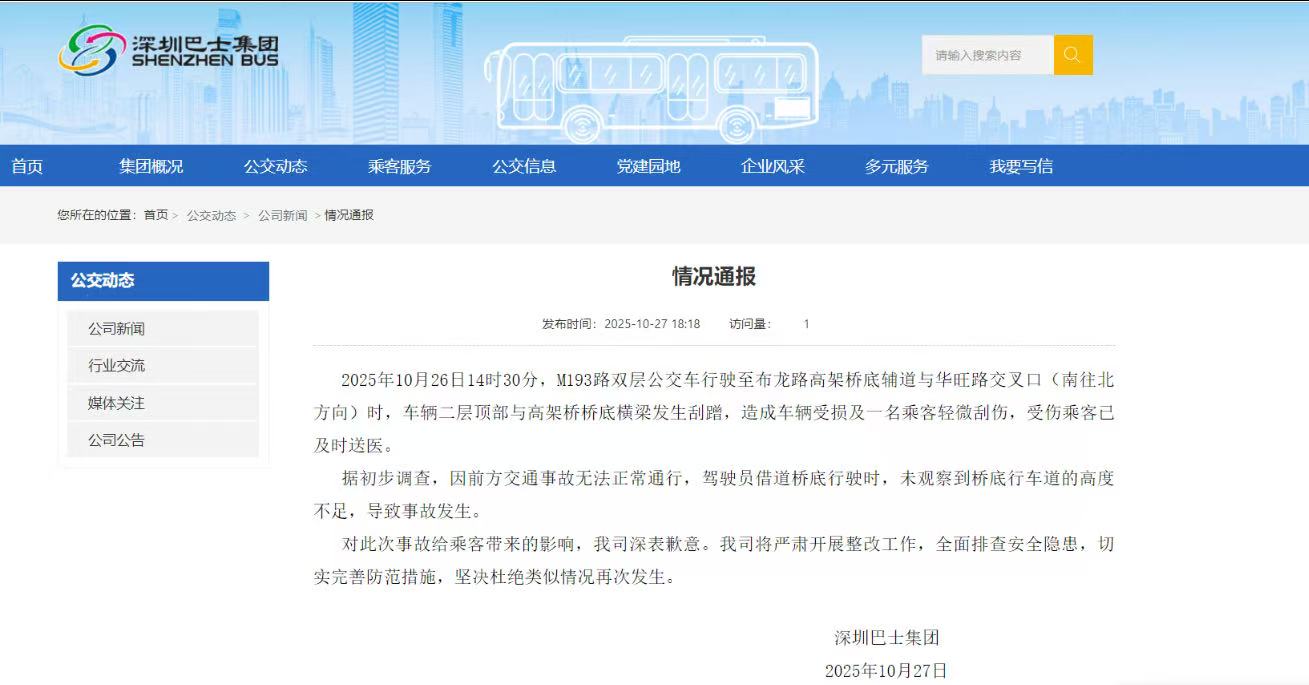 10月26 日,深圳一双层巴士在行驶时发生交通事故,顶部受损,引发关注。27日,深圳巴士集团对事故进行回应,证实该车辆与高架桥桥底横梁发生剐蹭,造成车辆受损及一名乘客轻微刮伤,受伤乘客已及时送医。