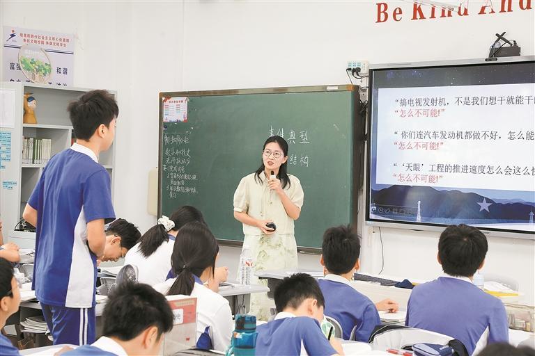 “见到南仁东爷爷,你最想问他什么问题?”话音未落,AI数字人“南仁东”面带慈祥笑容出现在电子屏上,八(8)班瞬间沸腾了起来。“FAST哪次技术难关最让您崩溃?如果收到‘天外之声’,您希望第一条信息是什么?……”学生们的问题创意迸发。范露露老师顺势为这篇自读课《天上有颗“南仁东星”》抛出“设计南仁东展”的三大“任务链”:梳理生平时间轴、设计图文内容、提炼精神内核——阅读、表达、写作三级进阶一气呵成。市教研员李燚鑫现场点评:以情境化探究贯穿课堂,大单元观念撬动思维,体现了从知识传递到能力建构、再到精神涵育的完整闭环,立德树人润物无声。
