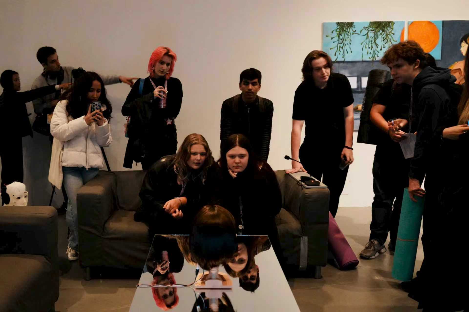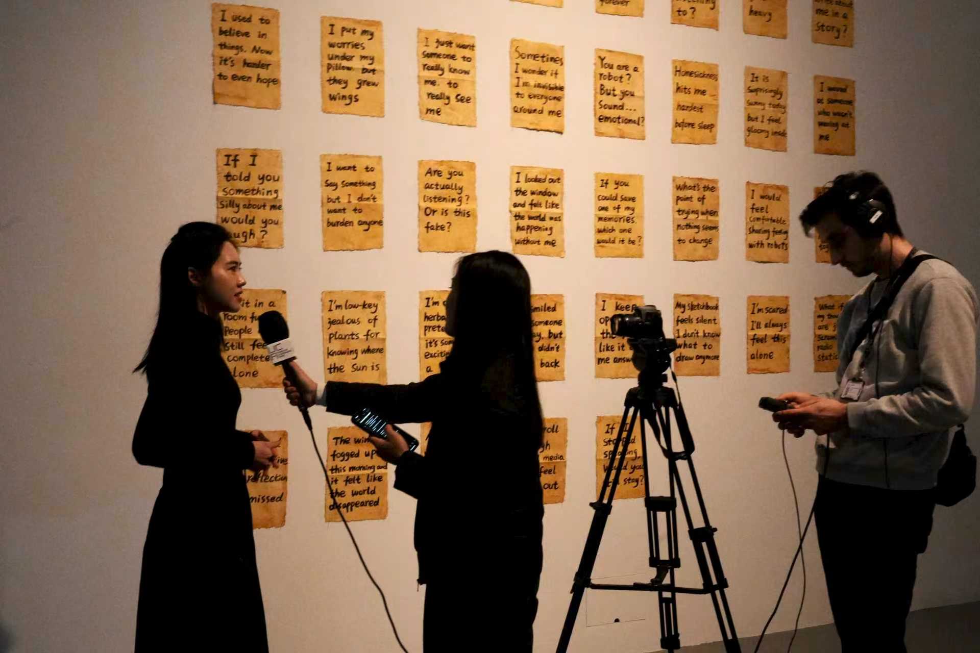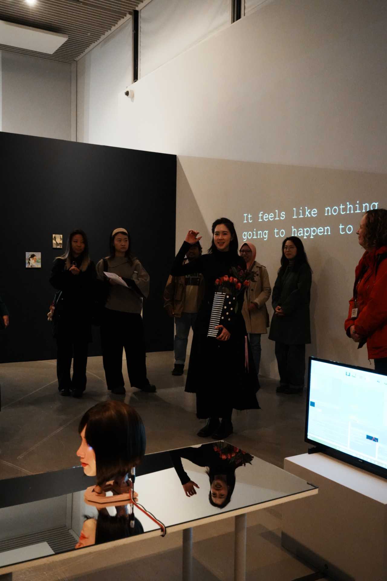 这场展览不仅记录了江中靖的博士研究历程,也营造了一个让情感与算法交汇的思考空间——在这里,人类的脆弱与机器的智能展开了一场诗意的对话。这件机器人作品是按照艺术家江中靖的脸扫描制作的,相当于1:1复制了艺术家的头。展览期间,众多观众前来参观,而英国的年轻人对Zhongjing 2.0表现出极大好奇心,纷纷与这一机器人化身进行互动。他们的热情参与凸显了作品的启发性——在当今科技能够复制人类存在的时代,艺术家提出了一个令人深思的问题:什么才是真实?