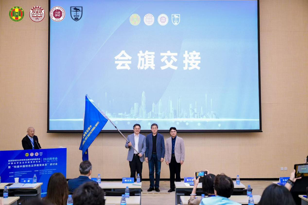 闭幕式上,中国法学会法学教育研究会副会长王健主持。诊所法律教育专业委员会主任龙翼飞,模拟法庭教学专业委员会主任许身健,昆明理工大学法学院院长李婉琳,西北政法大学副校长孙昊亮,北京理工大学法学院院长李寿平,华东理工大学法学院院长彭德雷,武汉大学人文社会科学研究院院长冯果,中国计量大学教授陈永强,河南财经政法大学副校长陈晓景,中国海洋大学法学院院长李晟汇报了各个分会场的研讨情况,深圳大学法学院院长熊伟代表承办单位向所有工作人员及参会嘉宾表示感谢,并与下届年会承办单位武汉大学法学院院长秦天宝交接会旗。本次会议的成功举办不仅为构建中国特色法学教育体系凝聚共识、明确路径,也将为法治中国建设筑牢人才根基、注入理论动能。