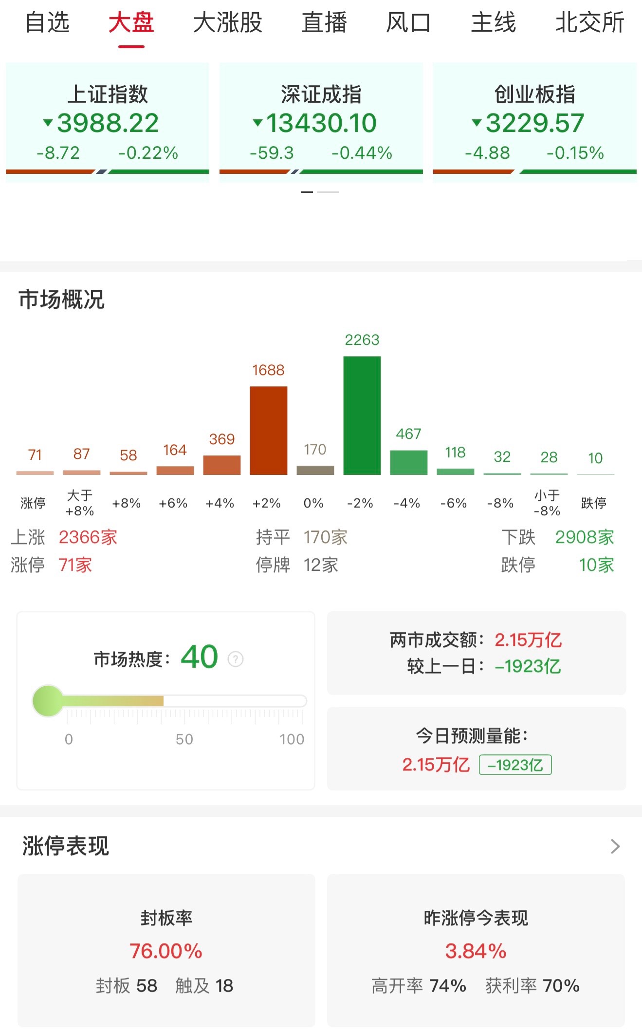 截至收盘,上证综指跌0.22%,报3988.22点;深证成指跌0.44%,报13430.1点;创业板指跌0.15%,报3229.58点。