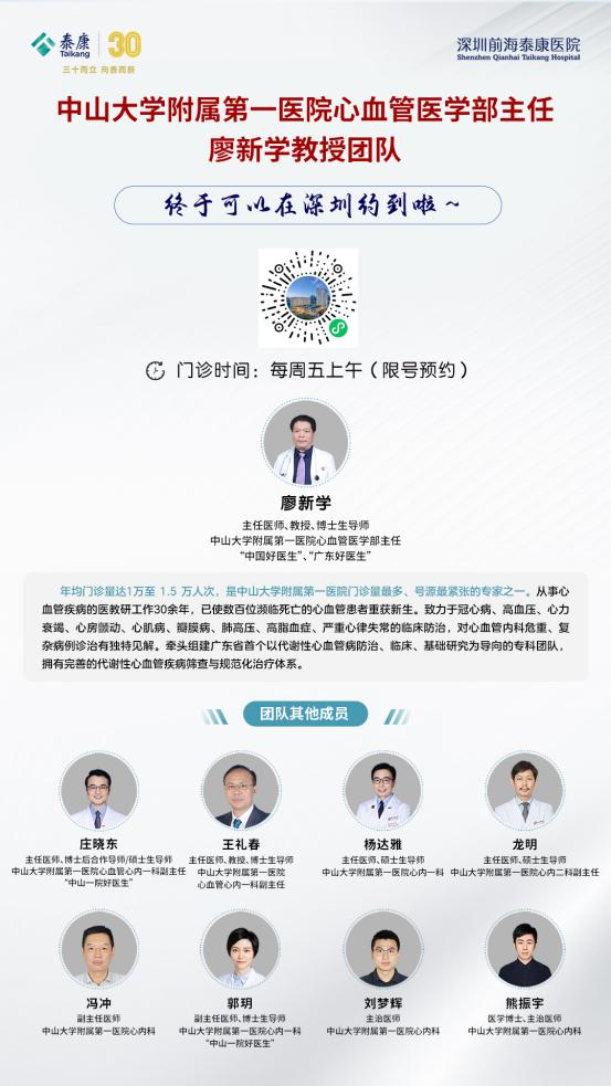据介绍,中山大学附属第一医院心血管医学部主任、著名心血管内科专家廖新学教授率领核心团队,通过固定门诊、教学查房、多学科会诊及手术指导等方式,全面推进深圳前海泰康医院心血管专科的学科建设与发展。