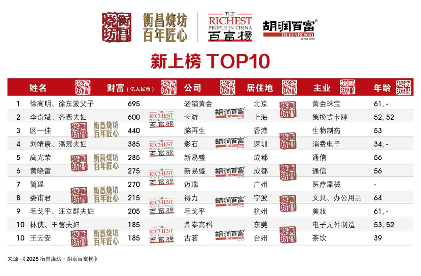 新人之首是老铺黄金的徐高明、徐东波父子,以695亿元财富跻身前100;其次是集换式卡牌龙头卡游的李奇斌、齐燕夫妇,财富600亿元。新人前十还包括智能影像设备企业影石34岁的刘靖康与其妻子潘瑶,财富385亿元。此外,“奶茶”界知名品牌古茗、霸王茶姬和沪上阿姨成功上市,创始人39岁的王云安、30岁的张俊杰和47岁的单卫钧与其妻子周蓉蓉分别以185亿元、135亿元和95亿元财富首次上榜。