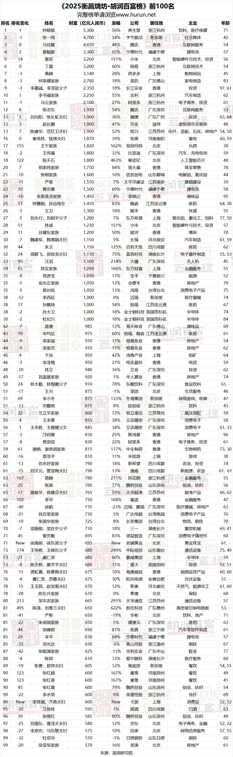 最后附上《2025衡昌烧坊·胡润百富榜》前100名完整名单↓↓