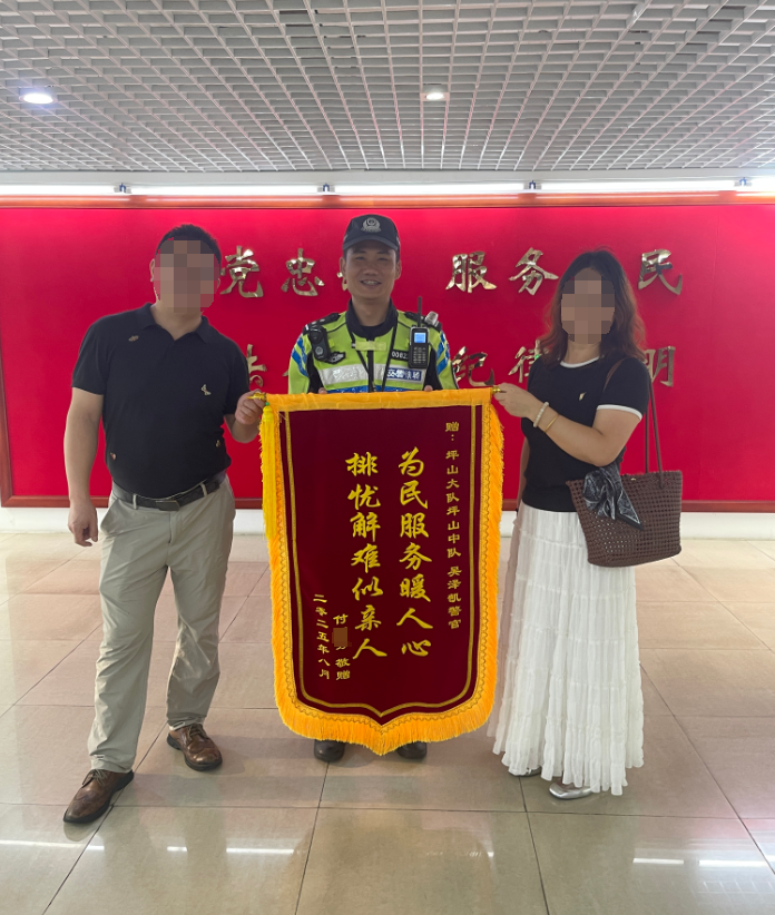 2025年10月18日下午,群众付女士与家人专程前往交通管理支队坪山大队坪山中队,将一面印着“为民服务暖人心 排忧解难似亲人”的锦旗送到铁骑队员手中。