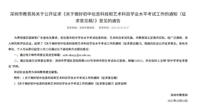 10月24日,深圳市教育局在官网上发布公开征求《关于做好初中信息科技和艺术科目学业水平考试工作的通知(征求意见稿)》意见的通告,就新的初中学考安排征求公众意见。