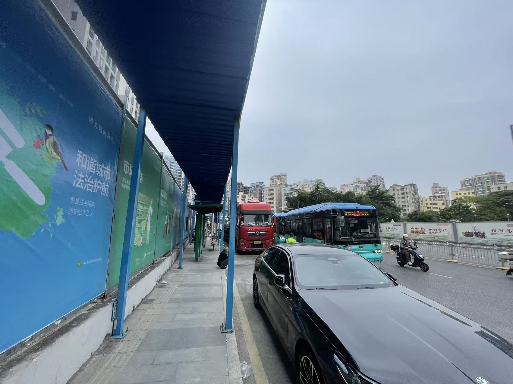 与郁青二路连接的新区大道上的阳台山东门站(含道路东西两侧站台)的人行道均较狭窄,仅容一人或一辆电单车通行,而且该路段的新区大道未设置非机动车道,既有电单车从机动车道上穿行,也有从人行道上穿行,这对于上下学时段在此候车的孩子和家长都有刮碰或摔伤危险。特别是该路西侧站台,因为有工地正在施工,站台前经常被施工车辆违停占据,对于候车的乘客危险更大。有家长说,上下学高峰期,站在该站台稍有不慎就会摔倒跌落,此前向相关部门反映过,一直未果。
