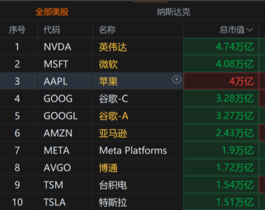 苹果微涨0.2%,总市值首次升破4万亿美元,美股4万亿美元市值上市公司已达3家。