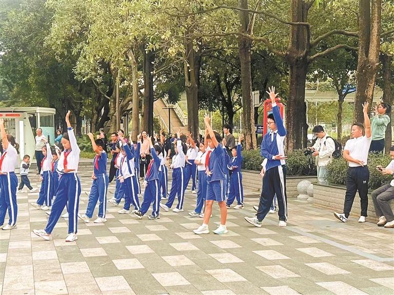 小区能人燕老师带领深圳实验光明学校武术社团与南方科技大学附属凤凰学校武术社团的30余名成员齐聚社区,以刚劲有力的招式、整齐划一的动作,为社区居民带来了一场视觉盛宴,展示国家级非物质文化遗产心意六合拳的独特魅力。