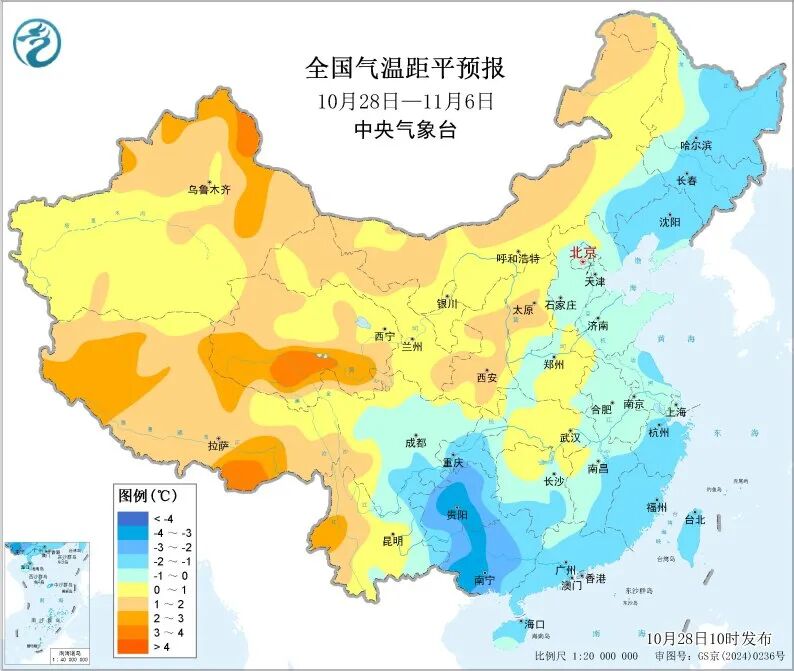 总体来看,10月底到11月初,北方大部气温在常年同期正常水平上下波动,由于雨雪稀少,昼夜温差比较大,普遍在10℃以上,西北、华北等多地温差在15℃以上,并且空气比较干燥,要注意补水。