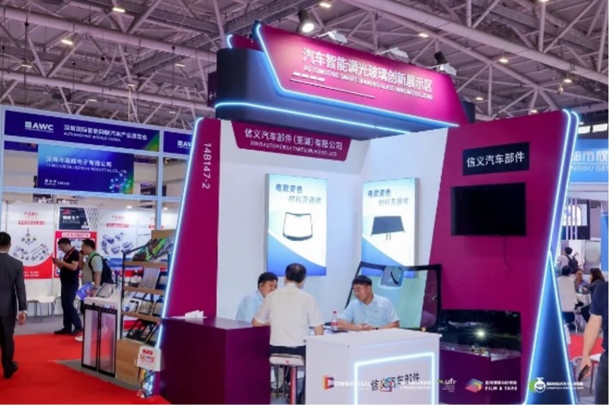 汽车智能调光玻璃创新技术展示区,集中展示汽车调光玻璃原料体系、技术方向和核心制造最新设备与尖端工艺,体现了智能汽车座舱更智能化、沉浸化、更安全的发展趋势。