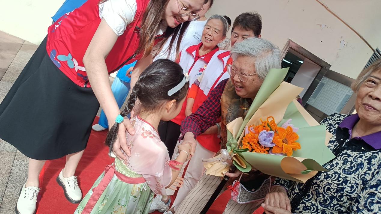 表演结束后,活动中最动人的环节,当属益强附属幼儿园的孩子们向现场长者赠送亲手制作的扭棒花束和DIY手工作品。孩子们满怀真诚怀着满满的真诚,将一份份饱含心意的礼物送到长者手中,并送上纯真的祝福:“爷爷奶奶,重阳节快乐,祝您健康长寿!”长者们接过礼物,脸上洋溢着幸福的笑容。其中,95岁高龄的杨阿姨更是激动不已,她轻轻地将送献花的孩子揽入怀中,眼中闪烁着感动的泪花。