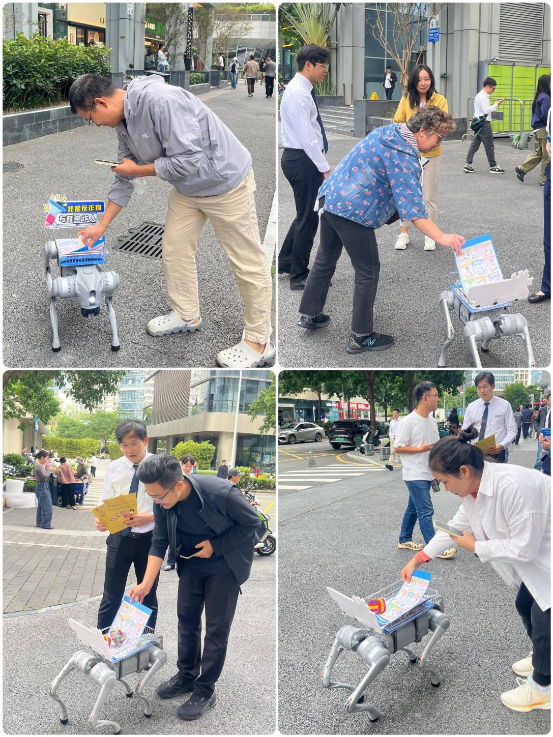 宣传模式的智能化升级成为本次活动的一大亮点。与以往单向发放折页却常被冷落不同,搭载宣传材料的智能机器狗作为移动宣传站,凭借其独特的科技感与亲和力打破了传统展台的静态局限。这只机器狗灵活地在人群中自主穿梭、主动停留,瞬间成为全场焦点。它的出现成功激发了市民的好奇心和参与热情,大家纷纷主动上前围观,并饶有兴致地从它身上取阅折页。这一创新举措使宣传材料从“静态陈列”转变为“动态邀约”,成功构建了“人找信息”的主动学习场景,实现了宣传效能的最大化,让每一份宣传材料都能高效触达受众。