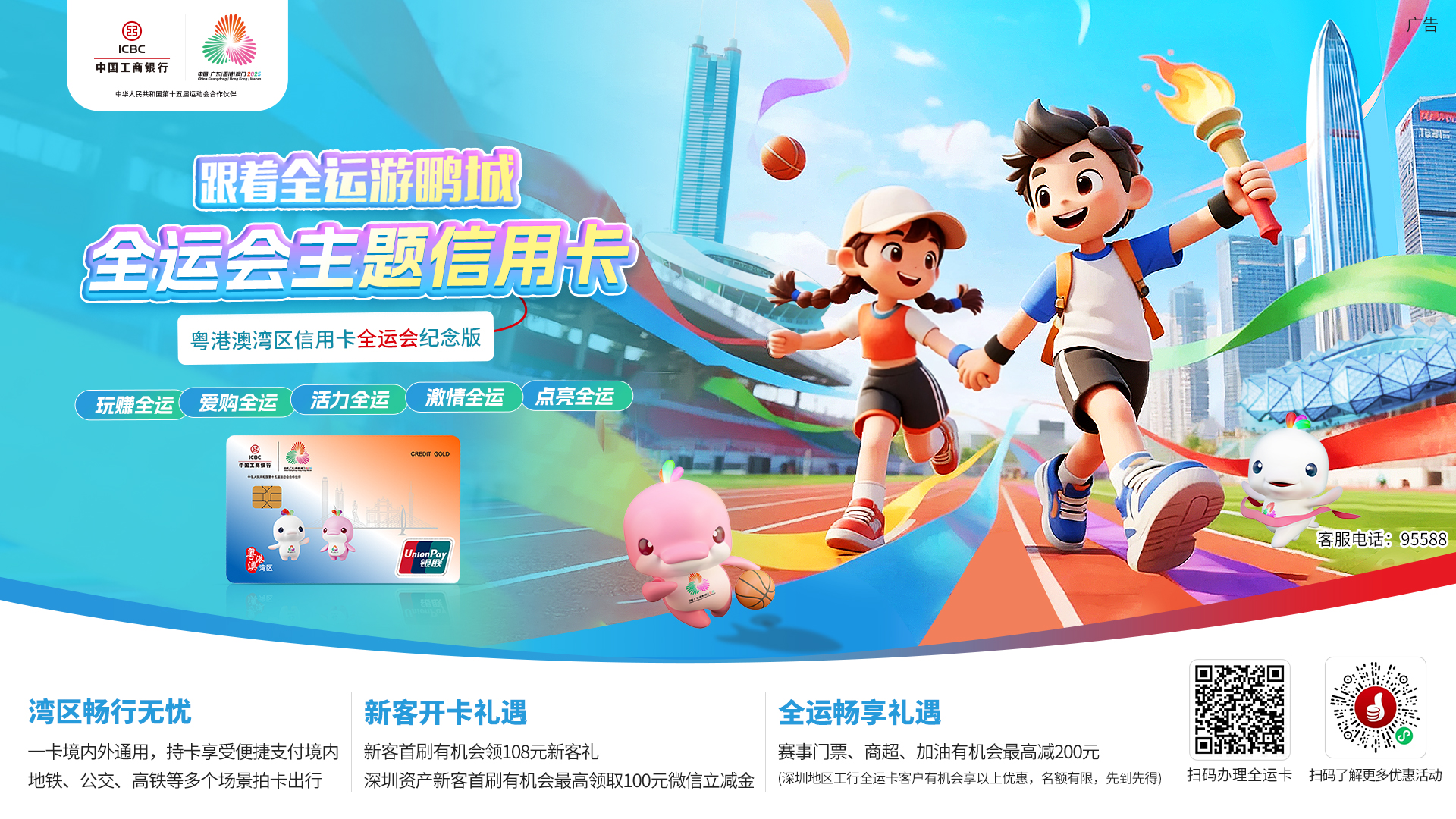 工行深圳市分行宣布,正式推出工银粤港澳湾区信用卡全运会纪念版,以卡为依托,特别推出“跟着全运游鹏城”专属活动,开辟深港交融、山海之城、动感湾区、活力商都、时尚引领5条主题线路,为居民提供“观赛、消费、出行”一站式优惠,让这场体育盛宴真正走进千家万户。