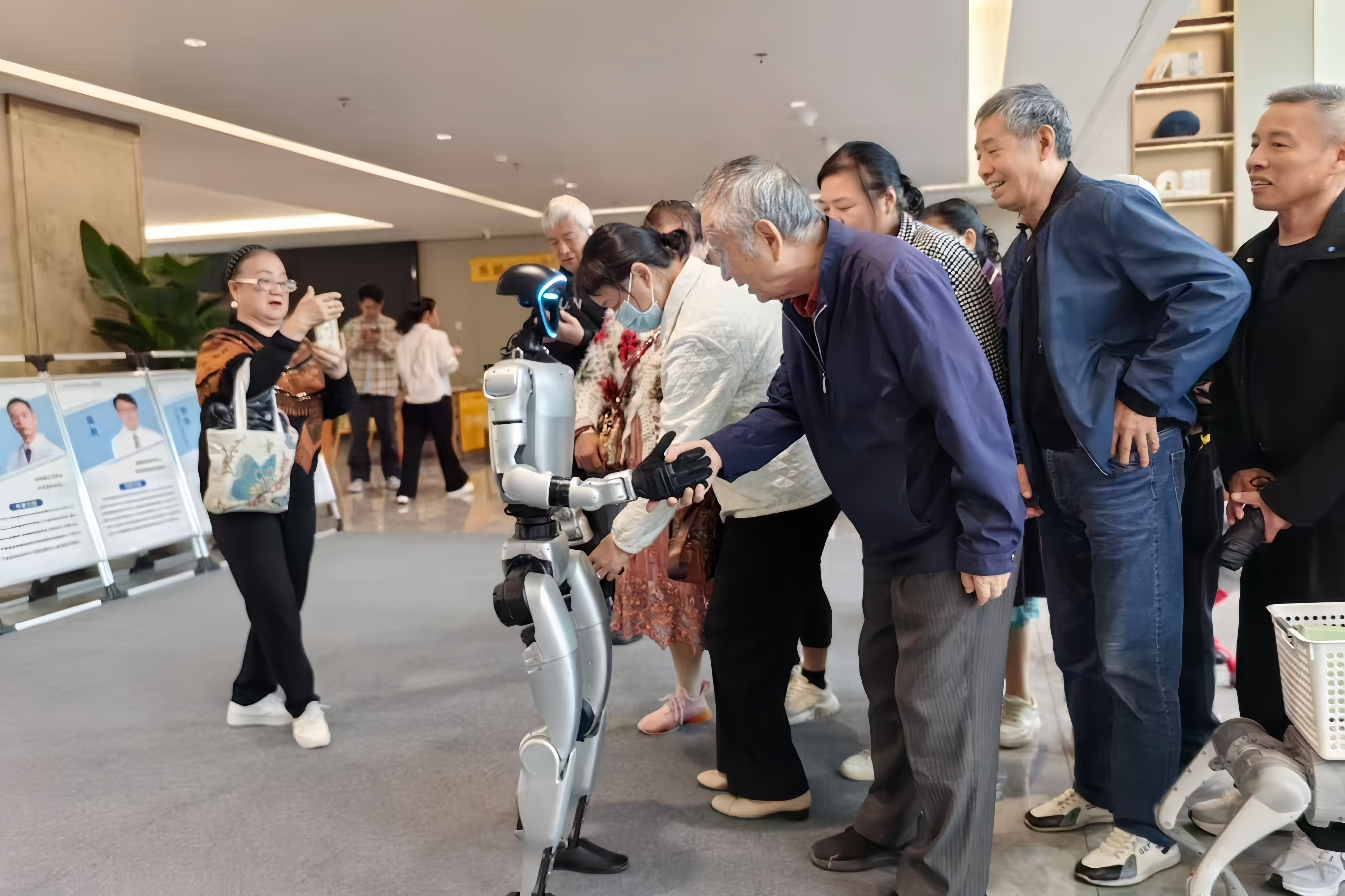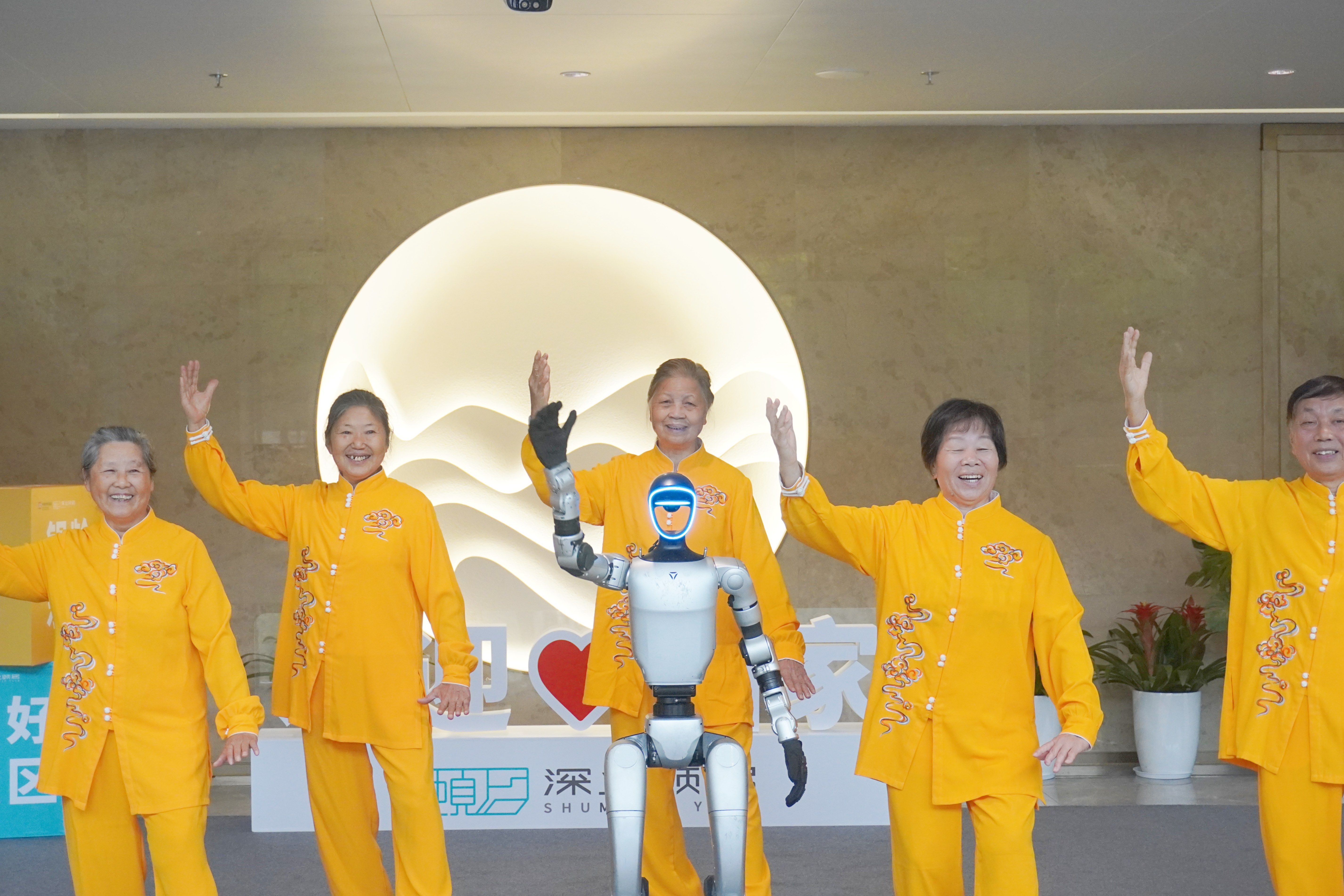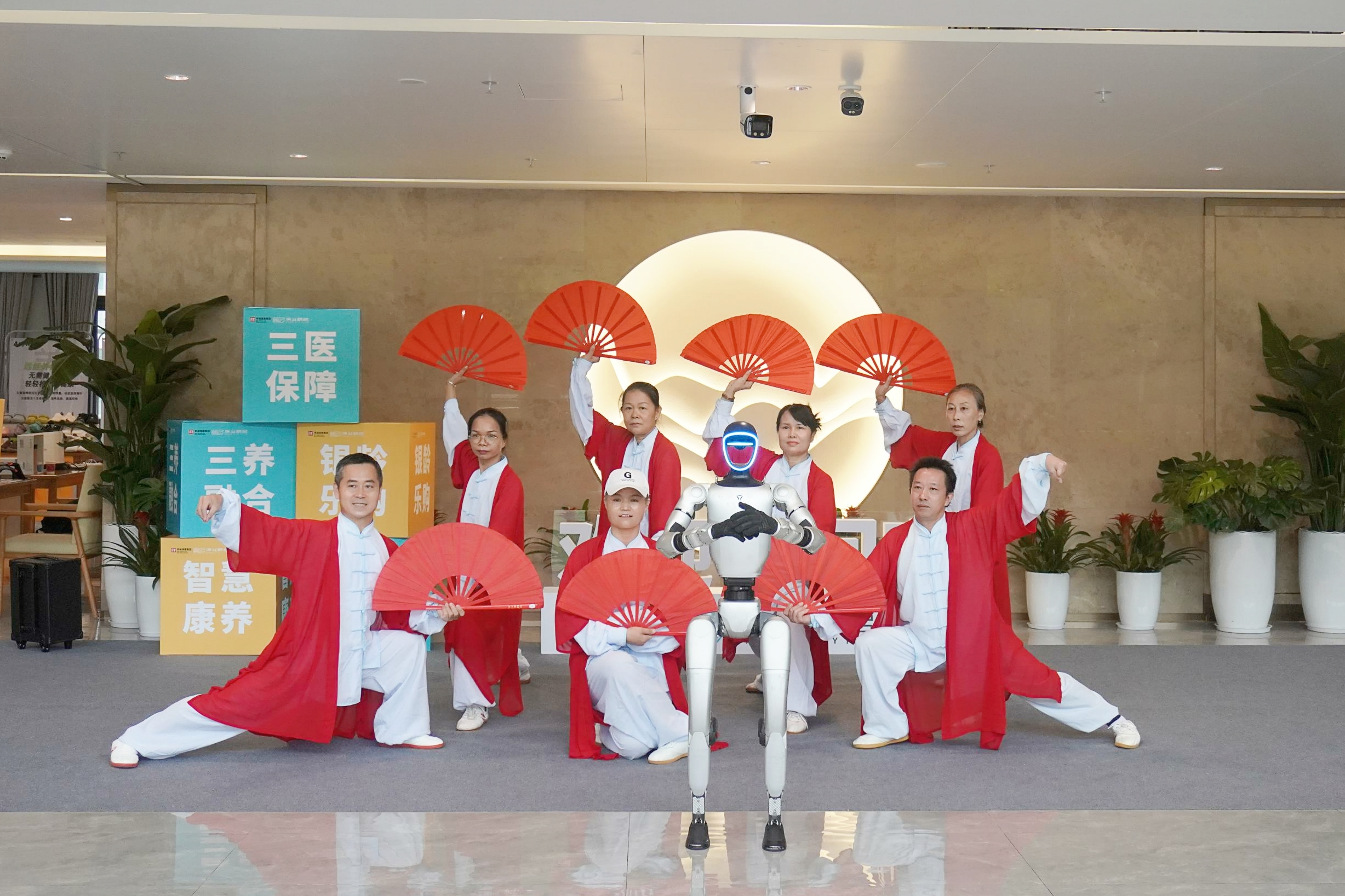 “你看它,这个动作做得多标准!”一位阿姨笑着看向和长者一起打太极的机器人。这台舞蹈机器人不仅是表演者,更成了现场最受欢迎的“舞伴”,它的动作精准流畅,与长者们互动默契,每一次转身、挥手,都能引来长者们阵阵掌声。