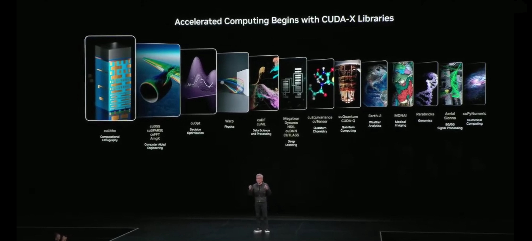 演讲开篇,黄仁勋再次提到摩尔定律。他表示,随着摩尔定律失效,加速计算和GPU技术成为推动技术进步的核心动力。