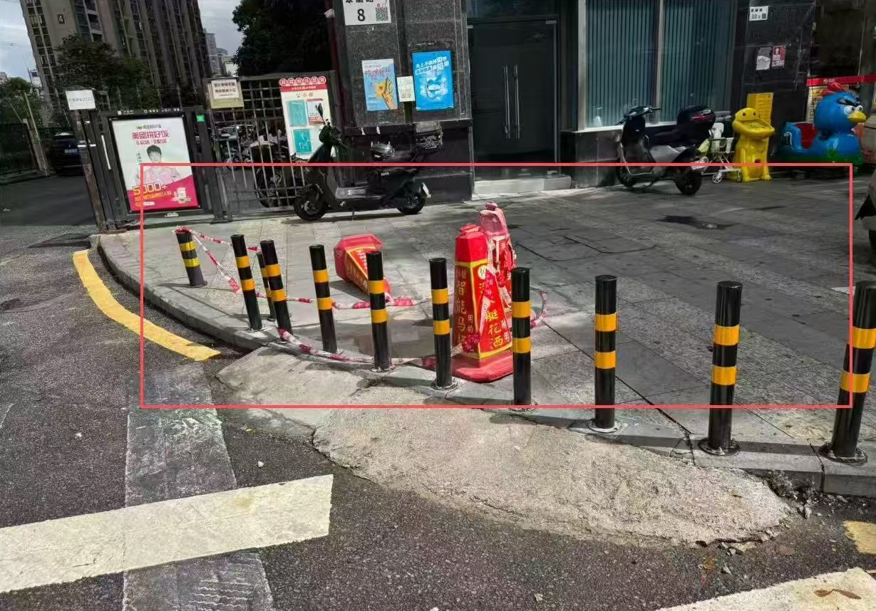 这一解决方案并未触及问题核心,反而为后续矛盾埋下伏笔。约一个月后,陶润懿峰小区在公共过道的出口处,设置了一排间距极为狭窄的阻行短柱,并将此前方便车辆上下的水泥小坡度彻底凿平。而短柱的间距仅能容纳一个成年人侧身通过,婴儿车、手推车、轮椅及电动自行车均无法通行。市民如果选择商铺过道,必须在尽头处费力地抬起婴儿车或自行车,跨过短柱和台阶。对于年轻人已是负担,对于老年人而言则几乎是不可能。
