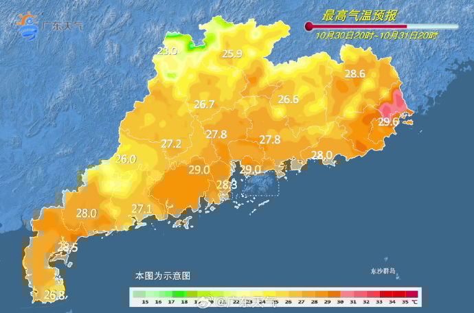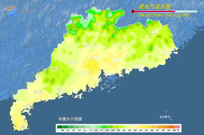 10月31日起受弱冷空气持续补充影响,各地日平均气温逐日略有下降,粤北偏北市县最低气温15~18℃,早晚体感清凉,注意适时增减衣物;广东省海面有东北风6~7级阵风8级。