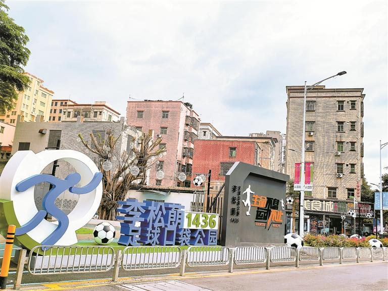 与此同时,足球也深度融入社区生活,点亮百姓的“微幸福”。近日,公明街道李松蓢社区1436足球口袋公园正式亮相。这座公园前身是一块设施老旧的闲置场地,面积800多平方米。社区结合十五运会赛事保障与“民生微实事”推进,通过精准改造唤醒“沉睡资源”。公园在保留原有大树坛的基础上铺设草坪,巧妙植入足球元素与文化符号,如足球摆件、主题装饰灯以及印有“1436”(呼应李松蓢社区于1436年建村历史)的大型金属烤漆字。如今,这里已成为全龄化“运动+休闲”的好去处,孩子们在安全颗粒橡胶地面上嬉戏,老年人在绿植环绕的休憩区晨练闲聊,亲子家庭在暖光路灯下共度温馨时光。这座“口袋公园”一开园即成为社区“网红打卡地”和居民生活的“幸福增量”,以“小空间”承载了足球“大情怀”,让赛事激情与邻里温情交融共生。