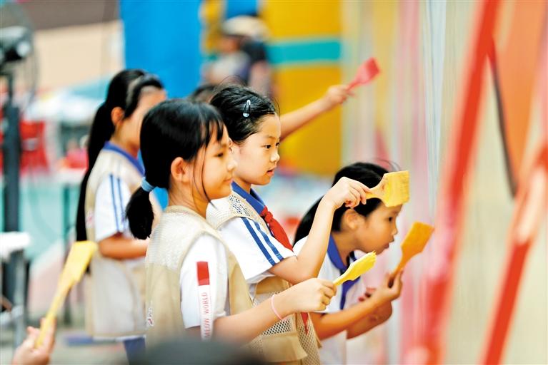 六头威风凛凛的醒狮,或昂首腾跃,或俯身探步,活灵活现,仿佛下一秒就要“破墙而出”。“我们以醒狮来迎接十五运,是因为醒狮代表着团结、拼搏与吉祥。”学生刘倩菲一边细心勾勒着狮头的纹路,一边对记者说。