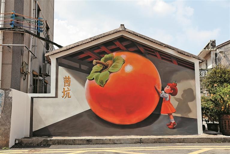 清晨的阳光,掠过福城街道茜坑老村百年老屋的飞檐翘角,温柔地洒在一面刚刚披上“新装”的灰白色墙壁上。墙上,一个直径近3米的橙红色“柿子”,饱满欲滴,仿佛刚从枝头摘下,又被巧妙地珍藏于这白墙灰瓦之中。几位早起的居民驻足观看,指着那逼真得仿佛触手可及的果实,脸上洋溢着惊奇与自豪的笑容。