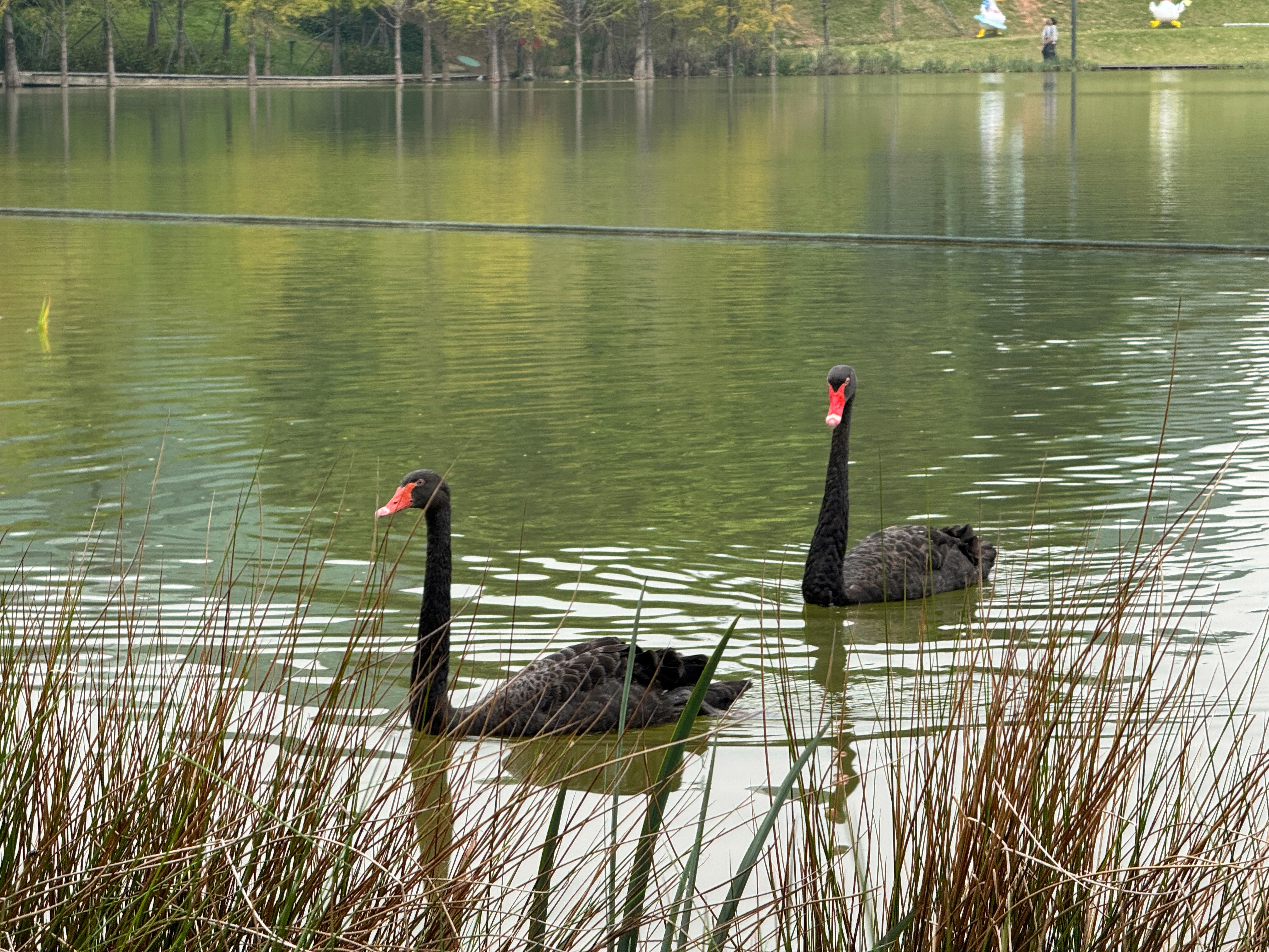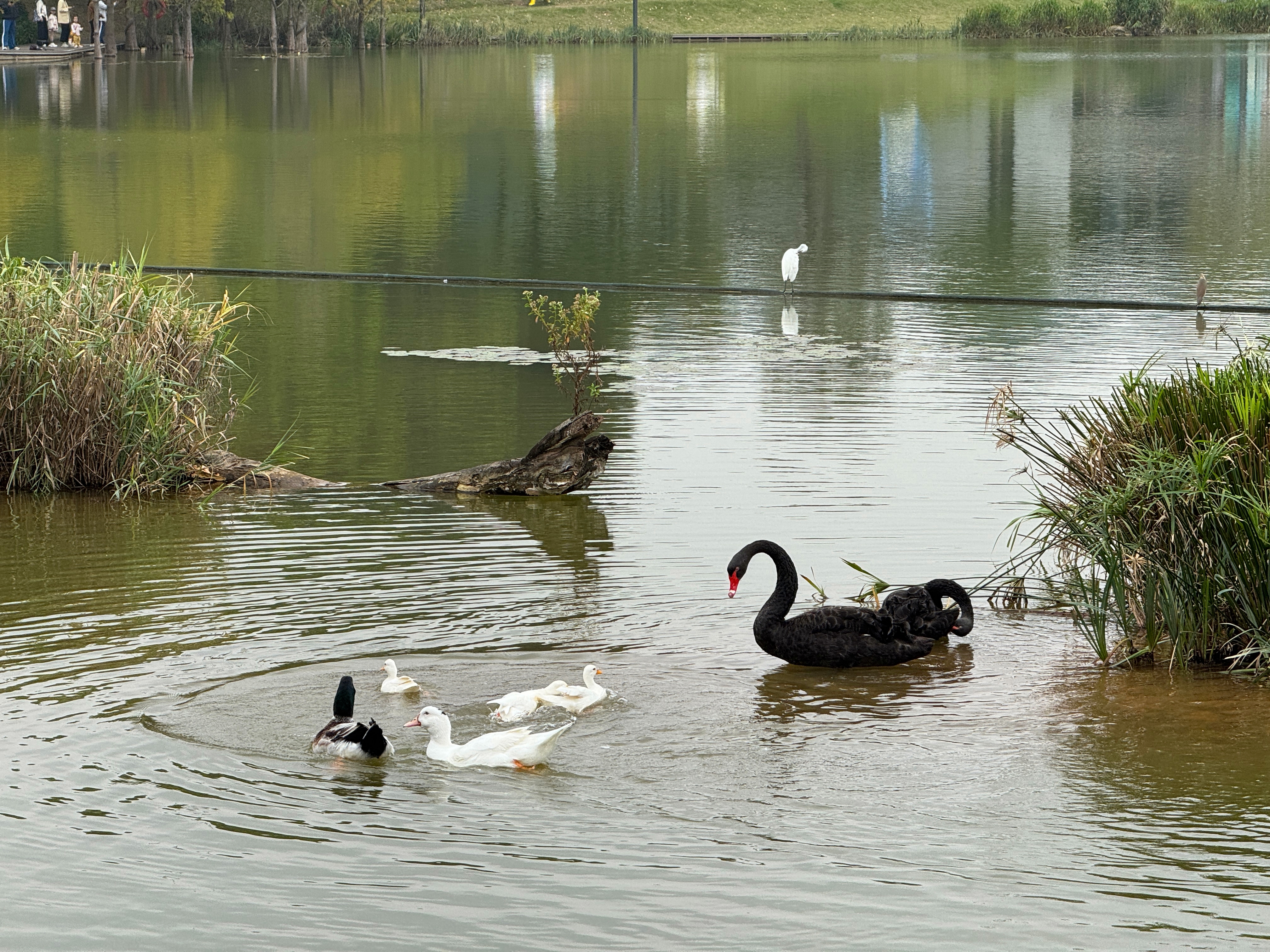 这片湖也是 “生机宝地”:白鹭总爱展开修长的翅膀掠过湖面,翅尖偶尔沾到湖水,溅起细碎的涟漪;黑天鹅常常成双成对地游弋,红色的喙在碧波上格外显眼,它们慢悠悠地划过水面,留下一道温柔的水痕。