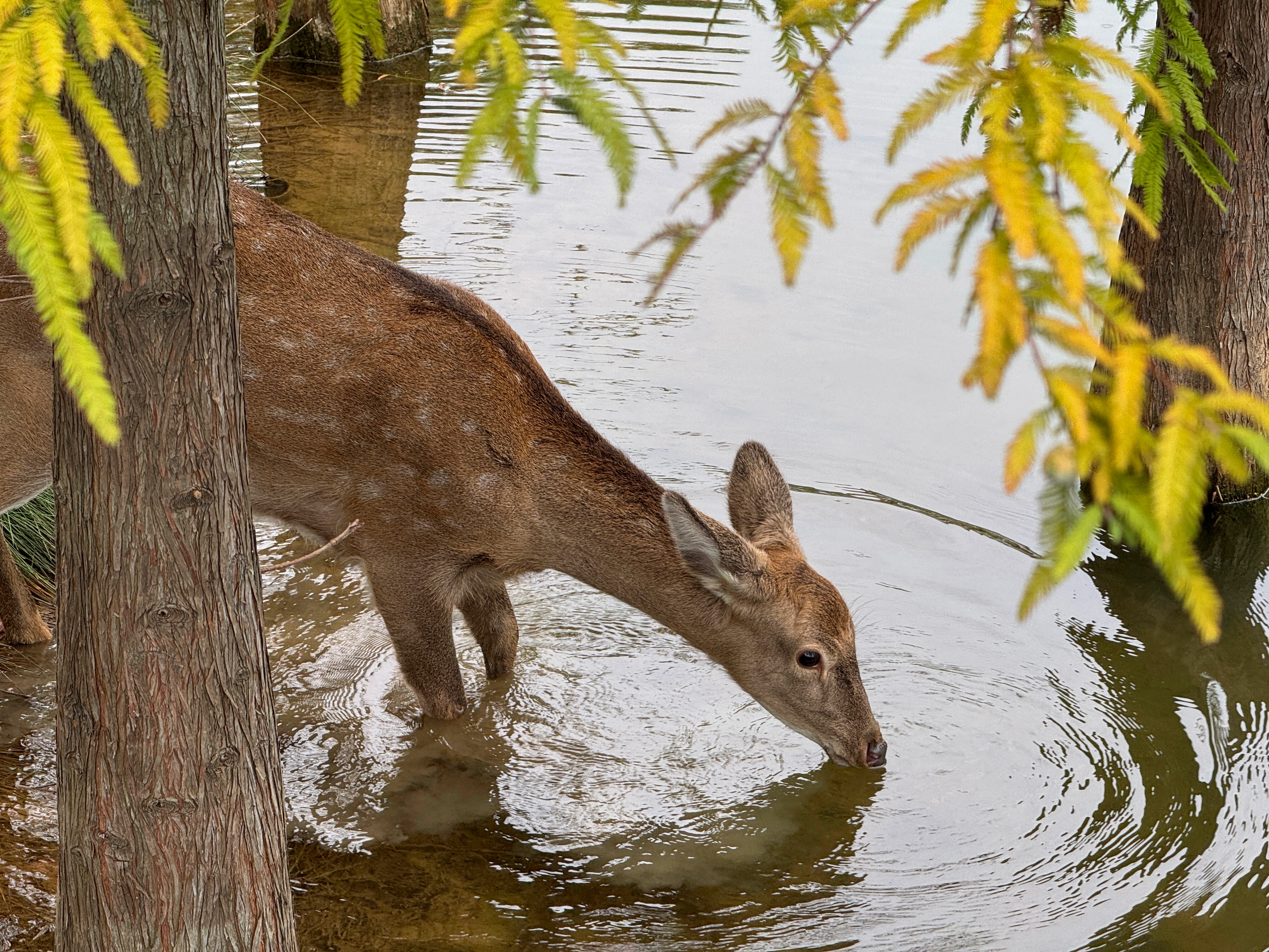 秋风吹着树叶,小鹿抬起长长的脖子,吃着树叶,再喝上几口河里的水。逛累的游人坐在河边歇脚,仿佛看到“呦呦鹿鸣,食野之苹”的诗意被搬进了都市里。