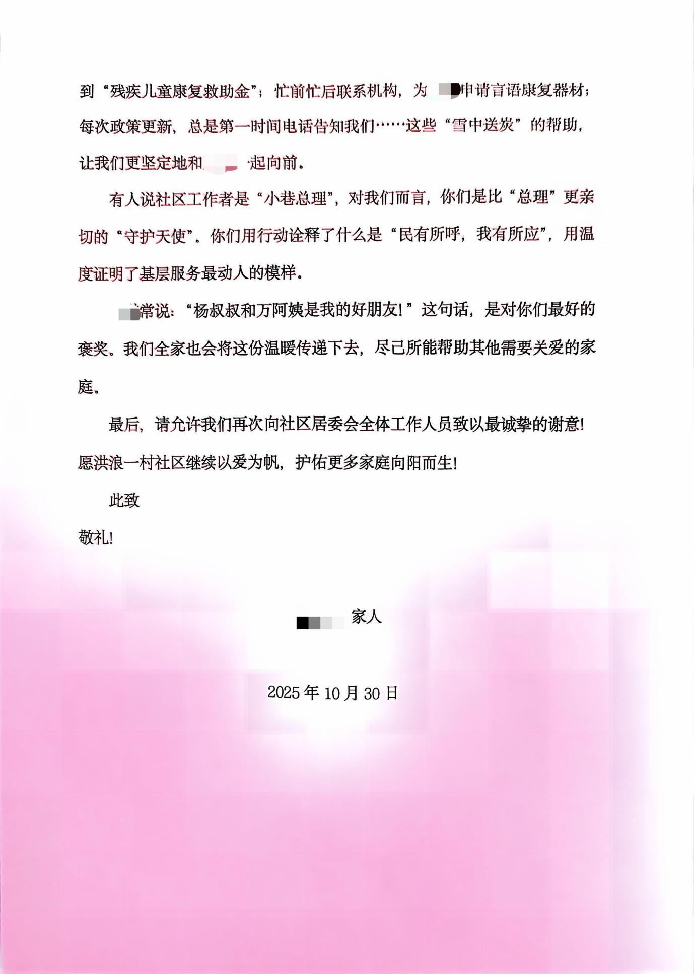 “小琪常说:‘杨叔叔和万阿姨是我的好朋友。’这句话就是孩子对你们最好的褒奖。”在感谢信中,小琪和家人讲述了社区为一家人的暖心服务——