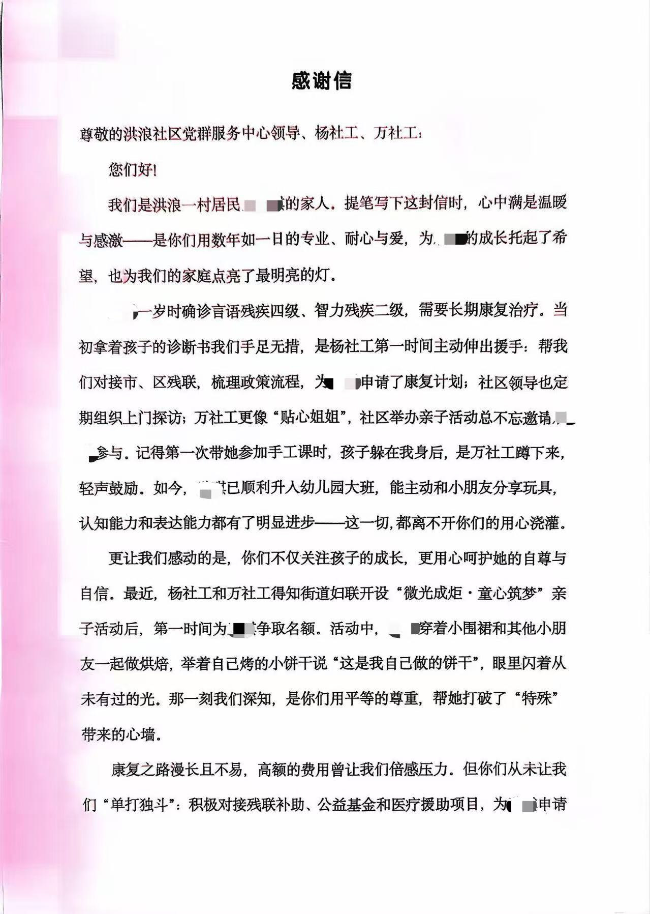 社区社工经常邀请小琪和妈妈参与亲子手工、趣味游戏等各类社区活动,鼓励小琪大胆表达、主动互动,慢慢帮她打开心扉,逐步建立自信,扩大了小琪的社会支持网络,助力她更好地融入社会。”如今,孩子已经顺利升入幼儿园大班,能够主动和小朋友分享玩具,认知能力和表达能力都有了明显的进步——这一切都不离不开你们的用心浇灌。”感谢信中,一行一句都能读到孩子的进步,读到社区的关爱,让人动容。