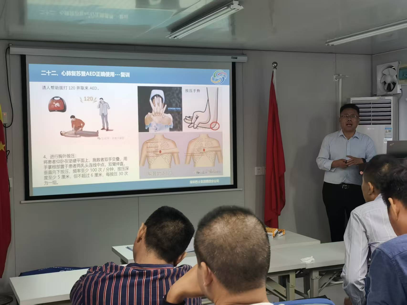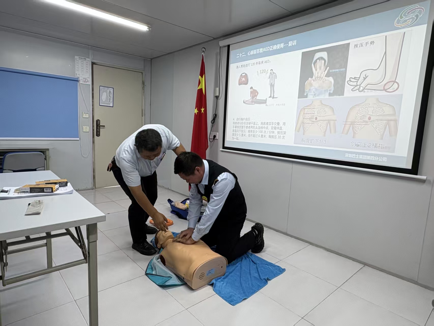 在应急技能培训环节,车队管理人员通过理论授课与实操演示相结合的方式,明确紧急情况中急救和自救的流程,讲解心肺复苏及AED设备使用的正确方法,驾驶员们分别进行了实操练习,车队工作人员现场纠错指导,确保每位参训人员都能掌握应急处置技能。此外,军训环节通过纪律教育,锤炼驾驶员们的严谨作风与团队协作能力,为安全营运注入纪律保障。