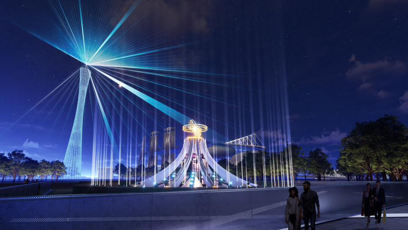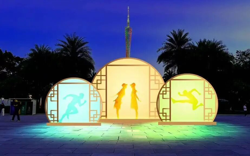 广东花城广场作品分设三大板块:北广场“新光”板块聚焦青年艺术家与高校艺术创作,《双生脉动》《新程扬帆》两组作品展现体育健儿坚韧不拔的拼搏意志和湾区人民的开拓精神;中广场“粤光”板块通过《光影成趣》《月光下的浪漫》等作品传递运动与城市共生的艺术哲思;南广场“城光”板块则突出科技发展,通过《桂冠》《出场自带光》《珠水月色》三组大型作品,凸显湾区人民筑梦圆梦的拼搏精神,传递湾区人民努力向上的生活态度,映射湾区人民和谐生动的幸福生活。