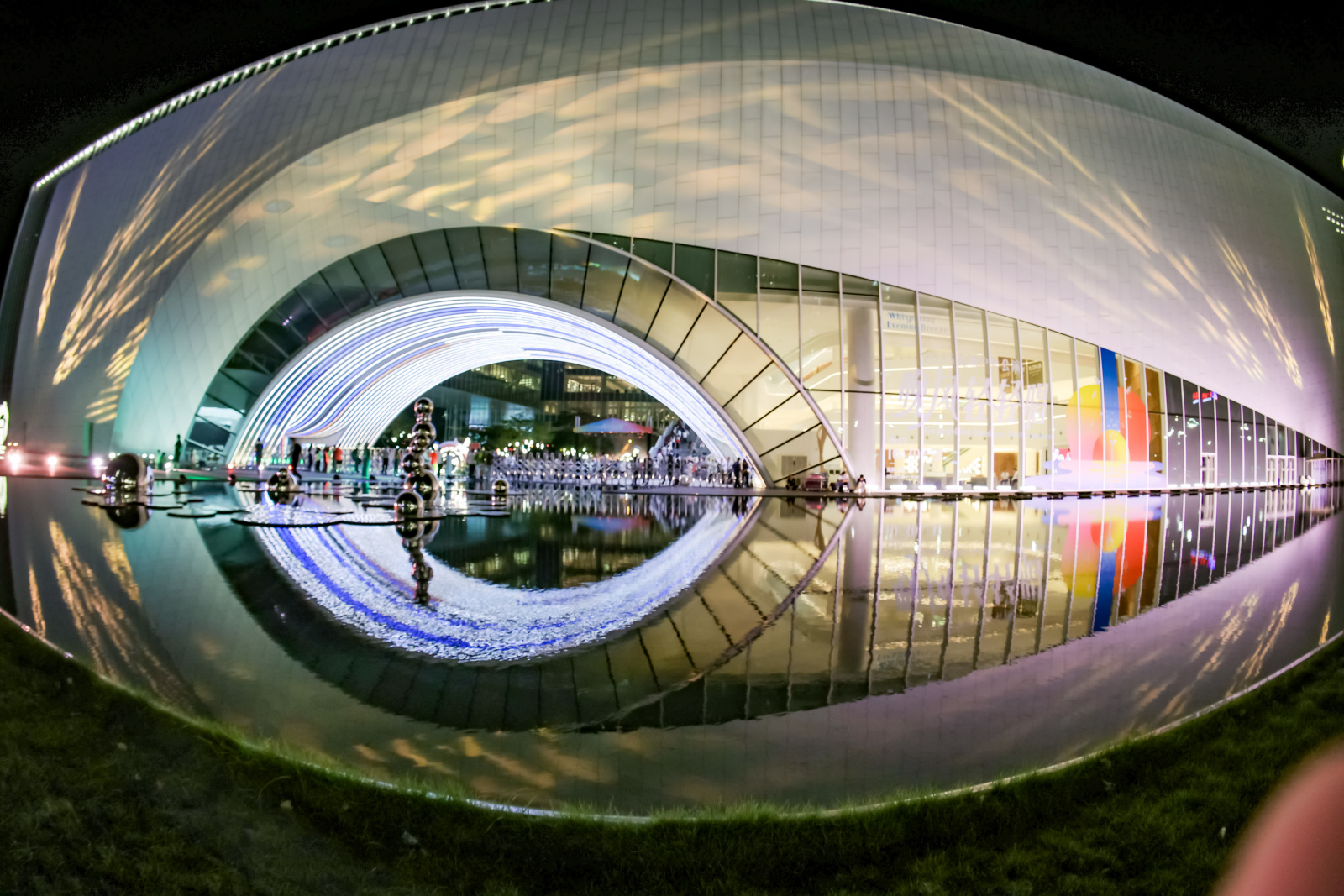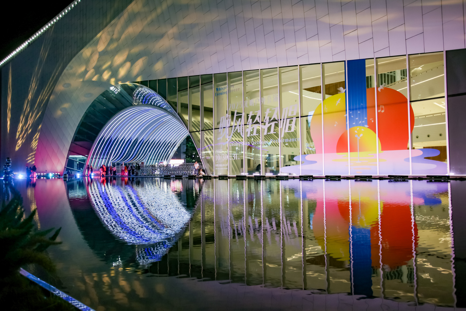 光明文化艺术中心户外中庭广场构成一个流动的“艺术场域”,自然树木舒展枝叶,特色公共艺术装置错落其间,柔和灯光与舞台旋律交相辉映。音乐与光影在同一片夜色中共振,形成视听交织的沉浸式体验,为市民开启了一个温柔而充满艺术气息的夜晚。