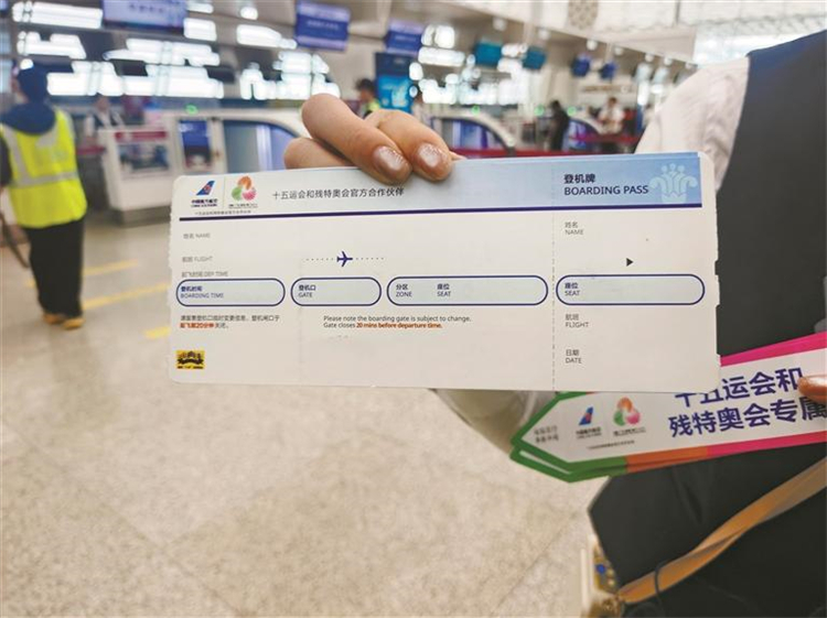 全新推出的十五運會和殘特奧會主題登機牌,更是實現了“出行工具+賽事紀念 +服務載體”的三重融合。登機牌上融入了賽事吉祥物、主題口號等元素,不僅是旅客登機的憑證,更成為極具收藏價值的賽事紀念品。同時,登機牌還承載着服務指引功能,清晰標註了專屬值機櫃枱、安檢通道等信息,方便旅客快速找到對應服務區域。