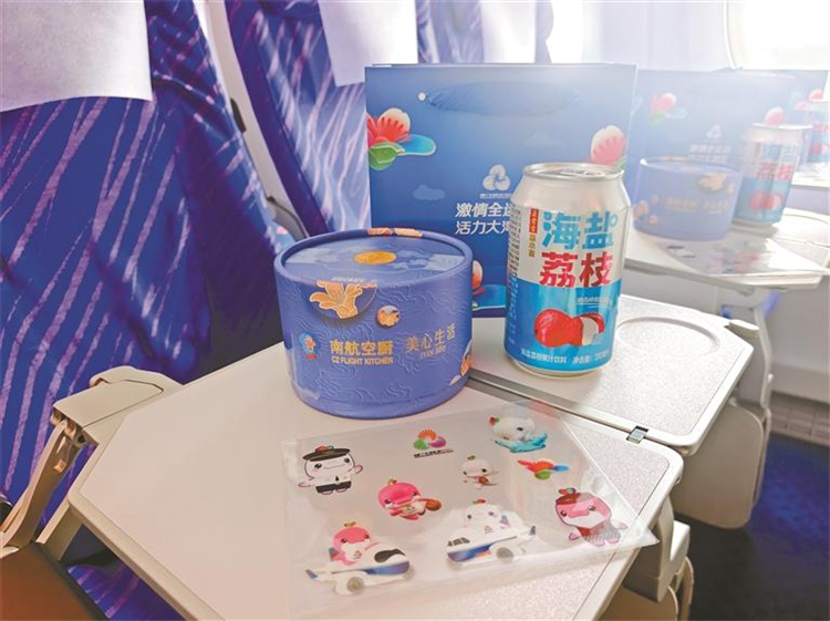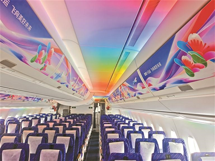 進入客艙,濃郁的賽事氛圍與嶺南文化氣息撲面而來。客艙內部以“喜上眉梢”為新中式設計主題,錦鯉、木棉花等裝飾元素巧妙呼應賽事舉辦地的嶺南文化特色。“我們希望通過這些細節設計,讓旅客在萬米高空就能感受到十五運的激情與大灣區的文化魅力。”嚴思詩介紹,客艙還配備了A350享譽全球的情景動態燈光,與十五運主題裝飾相得益彰,營造出沉浸式的乘機氛圍。此外,南航還全新升級了“雲端木棉”餐具與“御風飛行”香氛,進一步提升旅客的體驗感。