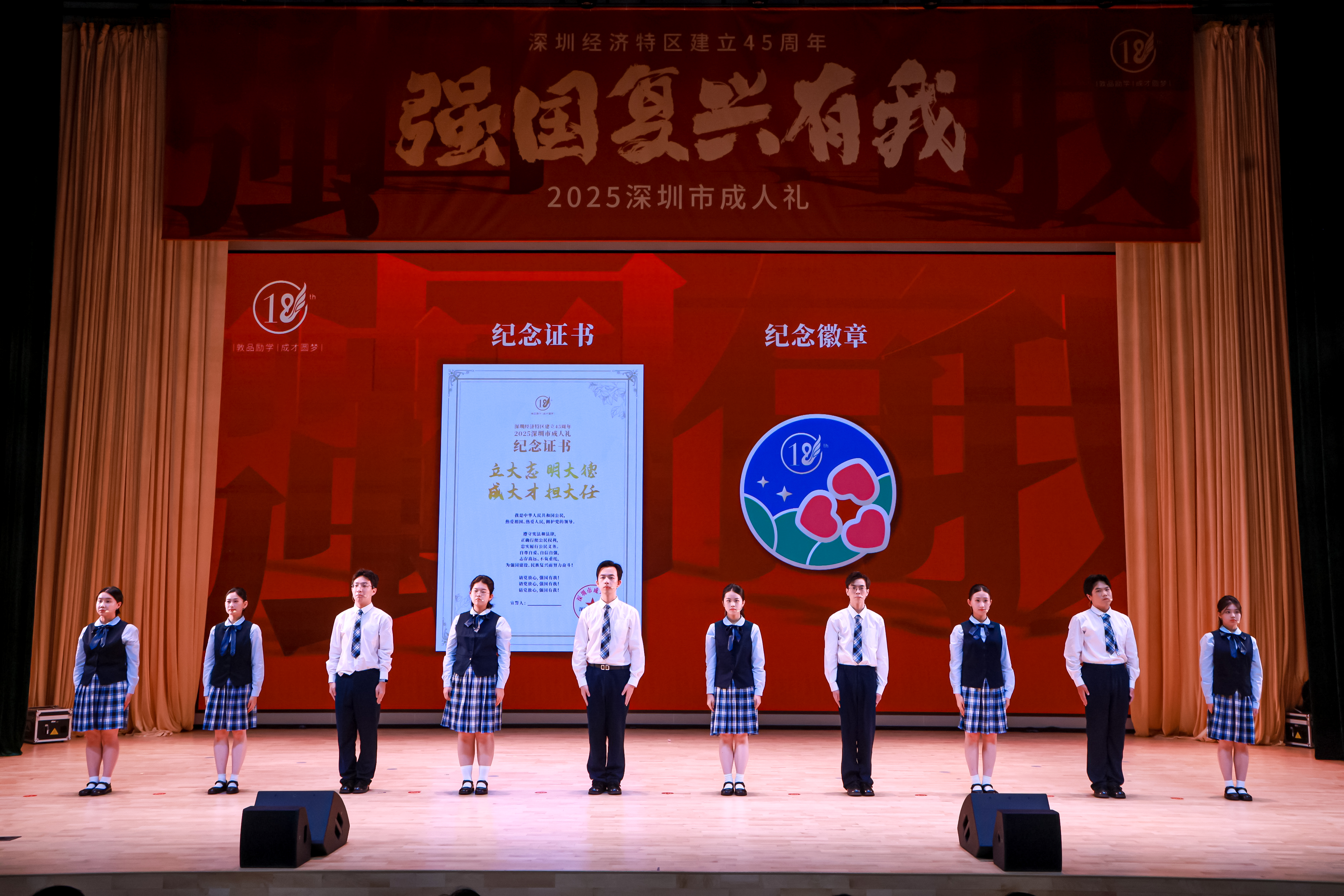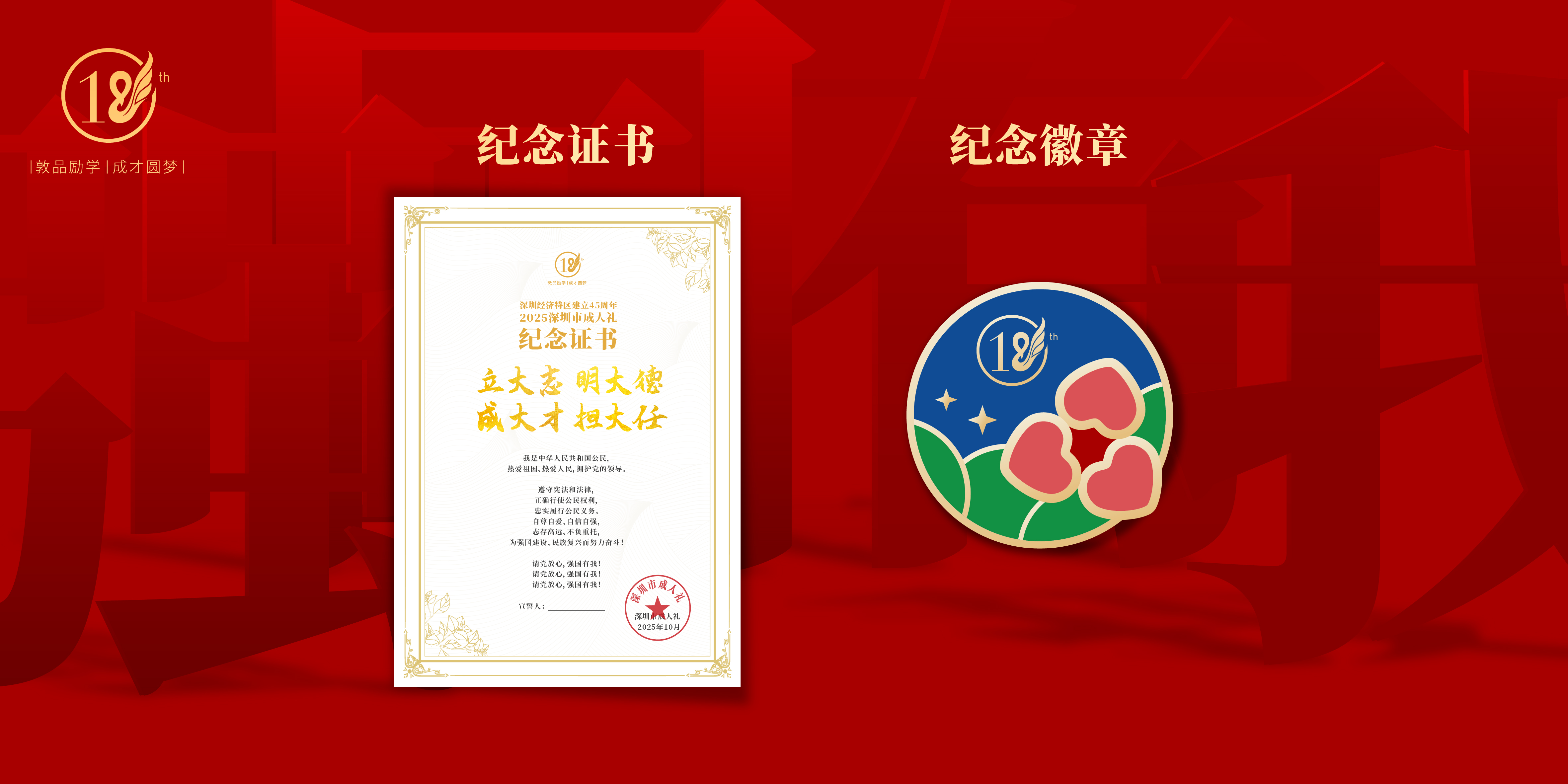 恰逢中国人民抗日战争暨世界反法西斯战争胜利80周年、深圳经济特区建立45周年,在2025年深圳市成人礼中,一份特别定制、饱含深意的成人礼物被郑重送至活动现场的青年学子代表手中——成人礼纪念证书与纪念徽章。仪式感的背后,是一座城市对年轻一代的殷殷寄望。