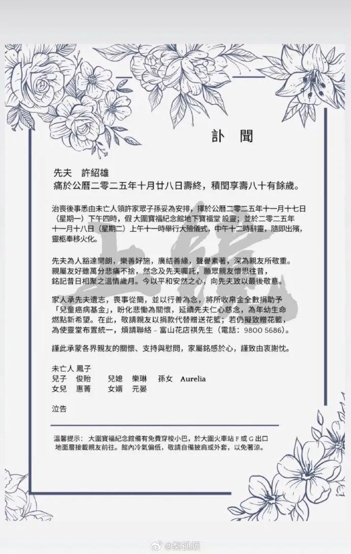 10月31日,黎芷珊发布许绍雄讣告:“治丧后事悉由未亡人领许家众子孙妥为安排,择于11月17日假大围宝福纪念馆地下宝福堂设灵,并于11月18日举行大殓仪式。”并表示将所收帛金全数捐助予“儿童癌病基金”。