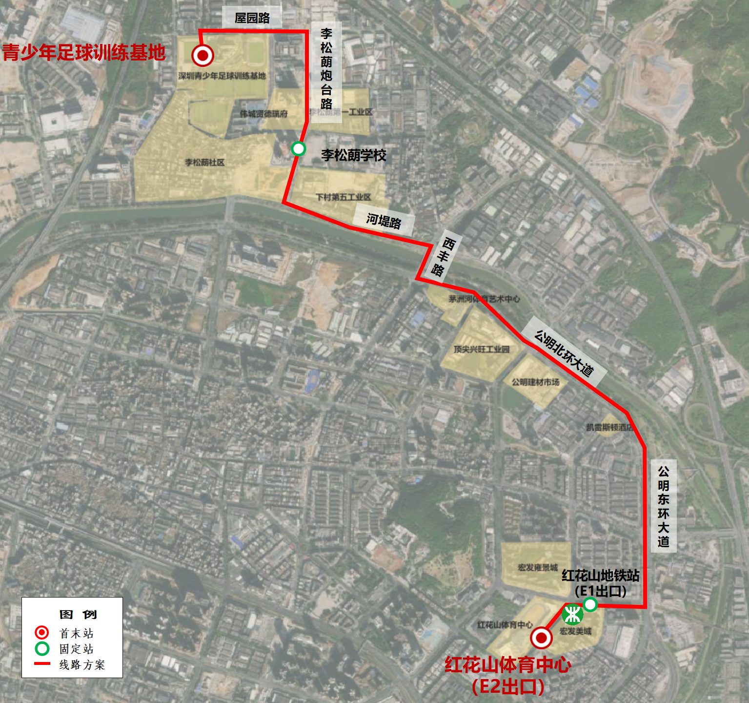 停靠站点:红花山体育中心(东侧)-红花山地铁站(南侧)-李松蓢学校(东侧)-深圳市青少年足球训练基地落客点