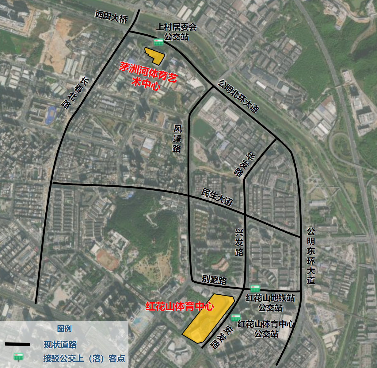 可导航定位至“红花山体育中心”或“茅洲河体育艺术中心”接驳点,按照标识指引牌前往接驳公交上客点,换乘对应赛事接驳公交专线直达比赛场馆。