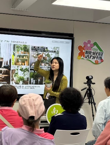 除了基础养护,讲师还分享了阳台改造的实用技巧,比如利用悬挂花架节省空间、用废旧花盆DIY创意容器,让居民意识到,即使是小阳台,也能通过巧思变身精致角落。