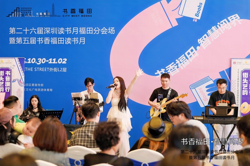 “书香福田·智慧阅界”嘉年华系列活动针对不同年龄段读者的活动同样丰富多彩。午间,小彼恩故事会《大脚印》温馨开讲,深耕幼教行业5年的卓茂全老师带领孩子们走进奇妙的阅读世界。夜幕降临,深业上城的阅读热情持续升温。“书音漫行·街头艺韵”民谣音乐会如期而至,湾得否、萤火music两支乐队带来治愈民谣与流行金曲,让阅读与音乐在初秋夜色中撞个满怀。换书大会的读者依然络绎不绝,孩子们在市集摊位前流连忘返。