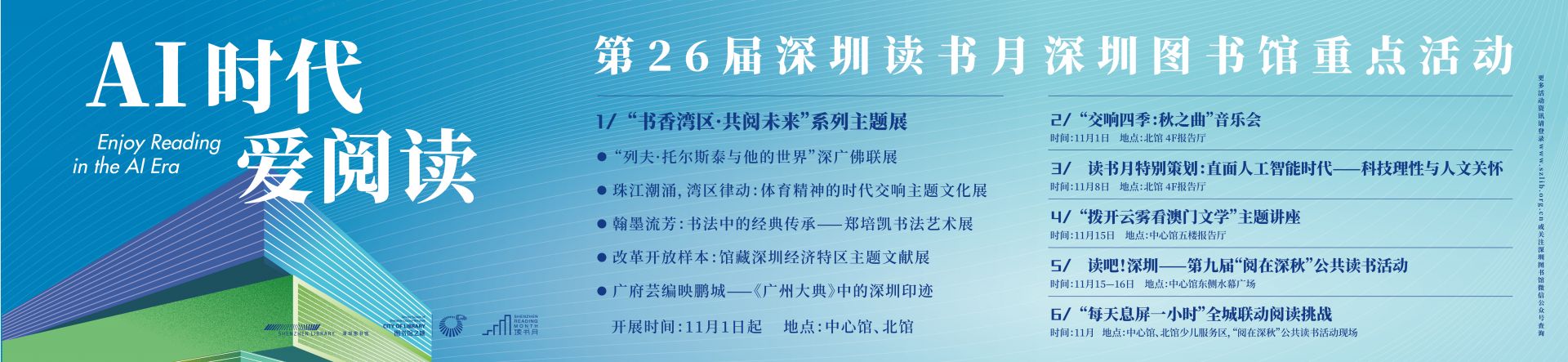金秋十一月,鹏城书香氤氲,深圳读书月如约而至。深圳图书馆紧扣本届读书月“AI时代 爱阅读”的年度主题,聚焦“文化交流”“时代主题”“湾区联动”“文化传承”“数智阅读”“创意阅读”“阅读关爱”等方向,精心策划近300场具有学术性、思想性、互动性、趣味性、创新性的文化活动,其中,重点主题活动共计35项。