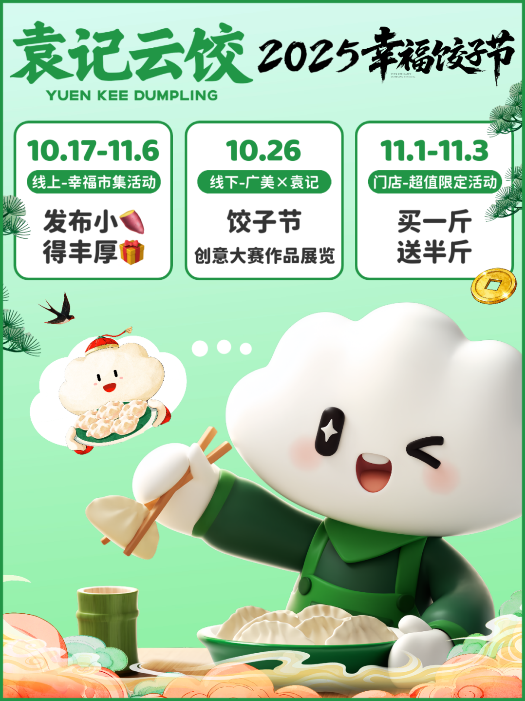 2025年11月1日至11月3日,袁记云饺第七届“幸福饺子节”正式拉开帷幕。本届饺子节延续线上线下联动模式,通过“幸福市集”互动话题、“创意饺子大赛”以及全国超5000家门店同步推出的“生鲜饺品买一斤送半斤”等系列活动,为消费者打造一场沉浸式的美食文化体验盛宴。