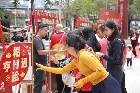 作为活动的核心环节,各类互动游戏在17个社区同步上演,成为邻里破冰、增进感情的重要载体。猜灯谜摊位前人头攒动,居民们或独自思索,或结伴探讨,在趣味问答中锻炼思维、分享乐趣,每一次猜中都能收获通关印章与满心欢喜;蒙眼击锣区充满欢乐,居民们在邻里的欢呼鼓劲中摸索前行,敲响铜锣的瞬间总能引发全场喝彩,即便未能精准击中,也能收获满场善意的笑声;投掷铜钱游戏考验专注力,大家屏气凝神瞄准目标,铜钱落下的清脆声响与成功击中后的欢呼声交织成最动听的旋律;眼疾手快游戏则点燃了参与热情,各个年龄段的居民纷纷挑战,在捕捉泡沫棒的过程中展现敏捷身手,趣味十足。
